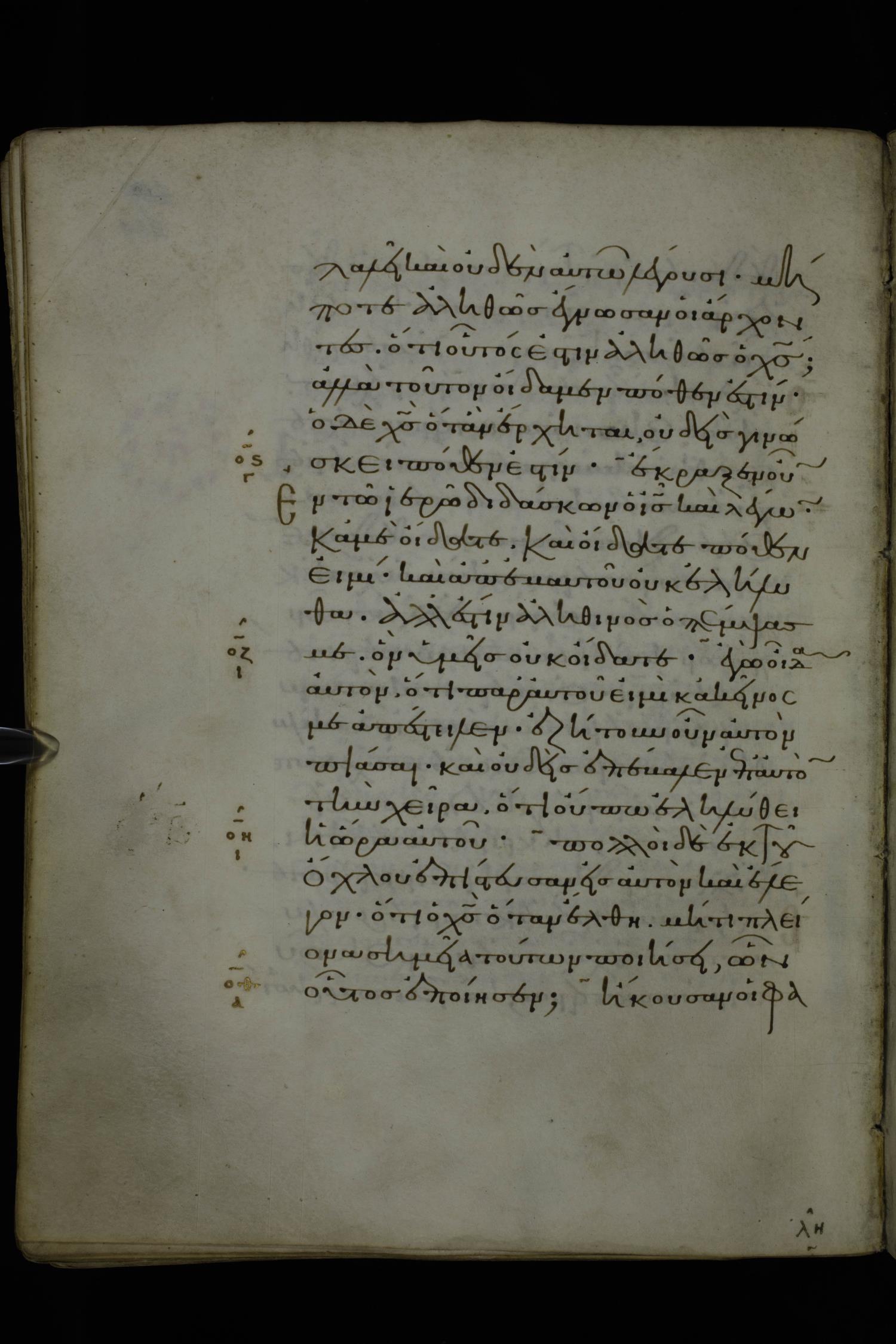 Eleventh century minuscule of Gospels on parchment; 370 leaves, 1 column, 20 lines per column. Images were taken at the National Library of Greece in Athens.