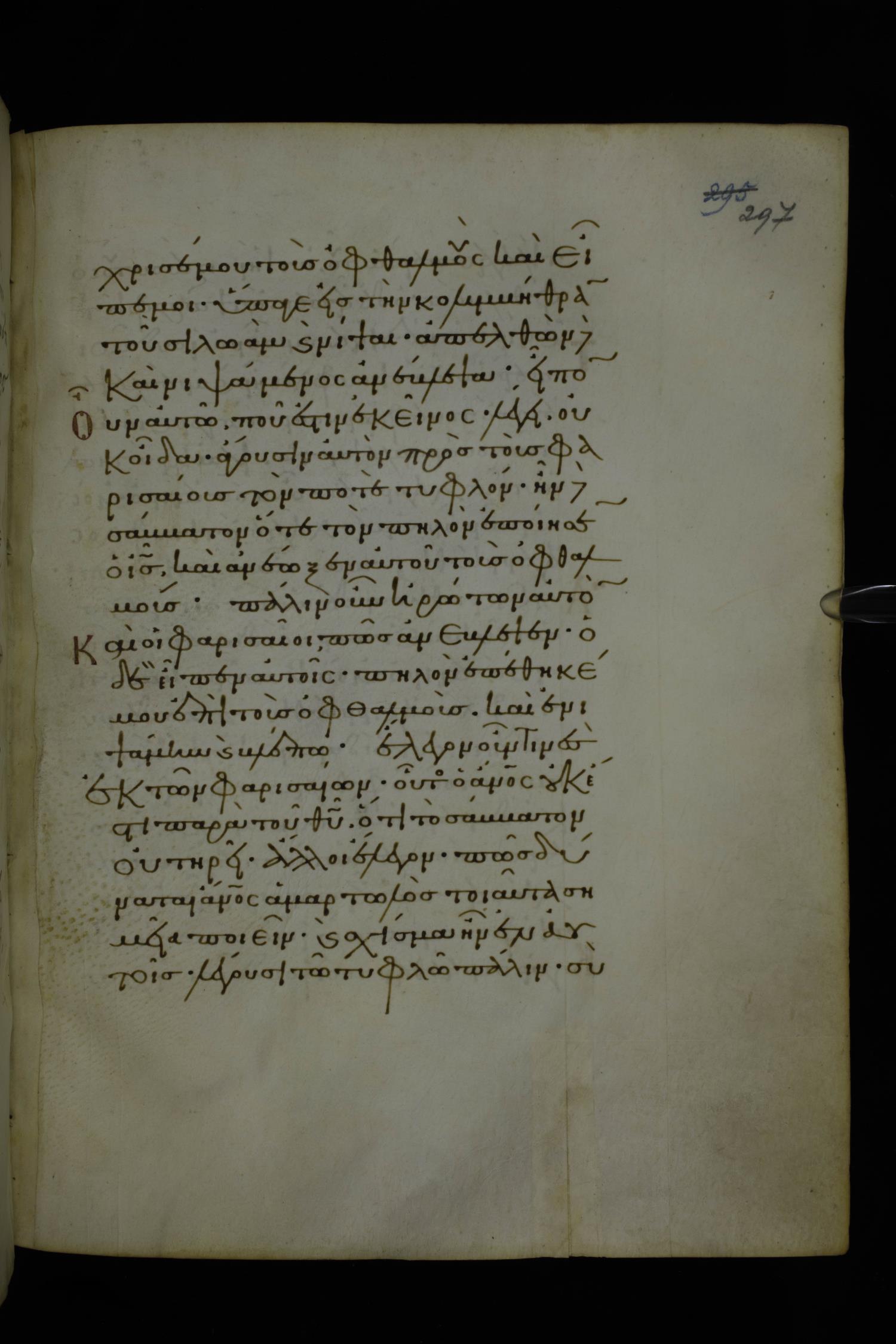 Eleventh century minuscule of Gospels on parchment; 370 leaves, 1 column, 20 lines per column. Images were taken at the National Library of Greece in Athens.