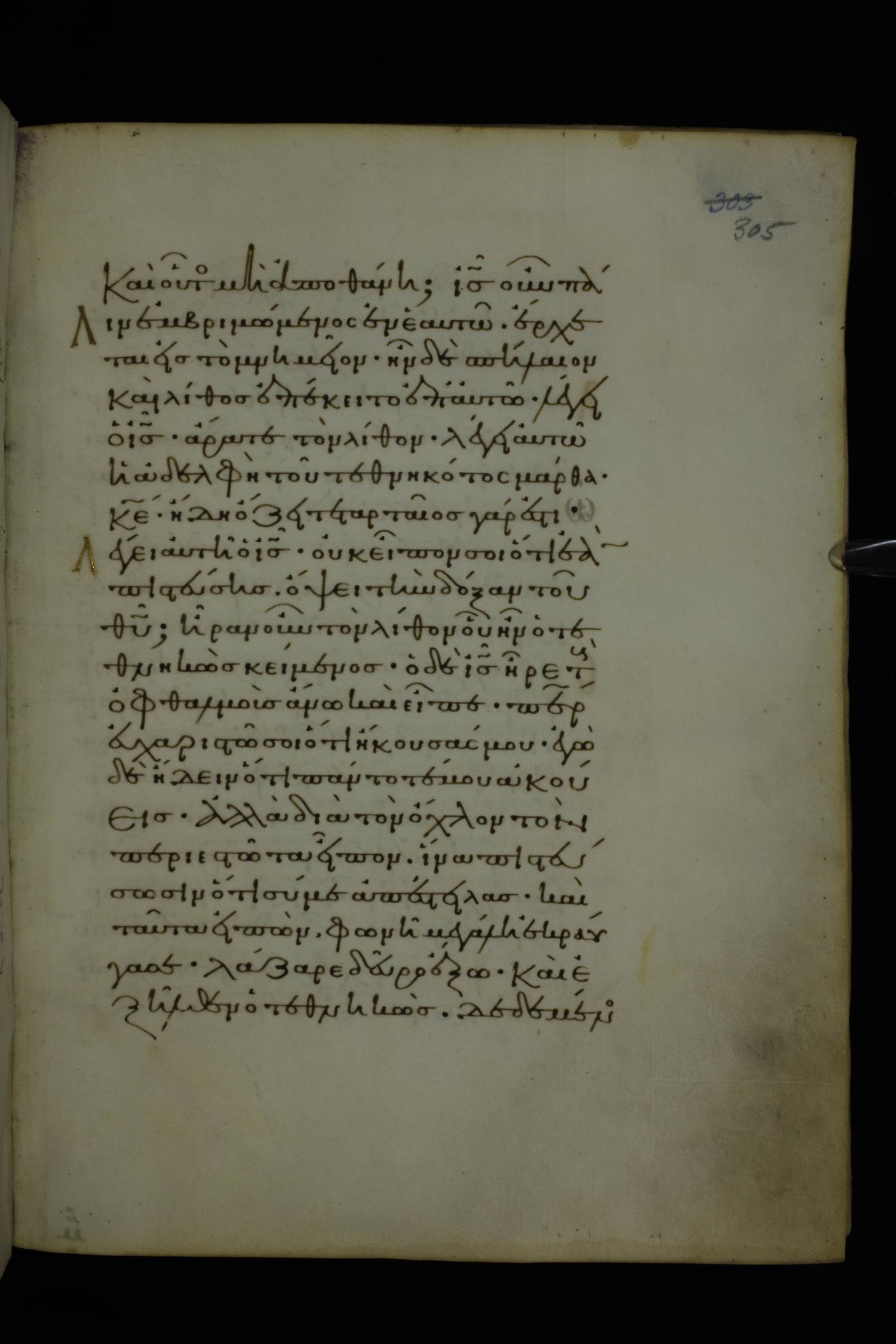 Eleventh century minuscule of Gospels on parchment; 370 leaves, 1 column, 20 lines per column. Images were taken at the National Library of Greece in Athens.