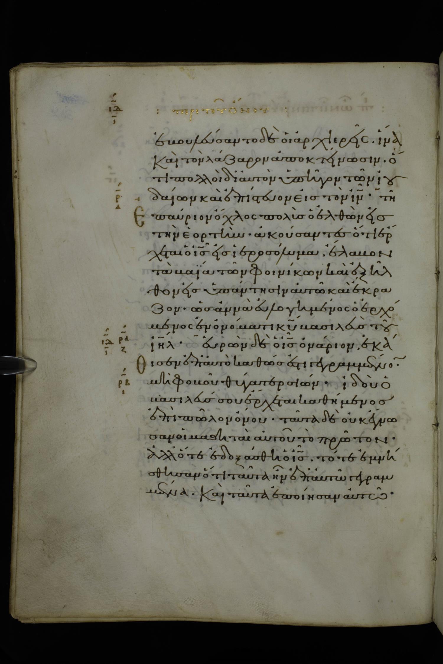 Eleventh century minuscule of Gospels on parchment; 370 leaves, 1 column, 20 lines per column. Images were taken at the National Library of Greece in Athens.