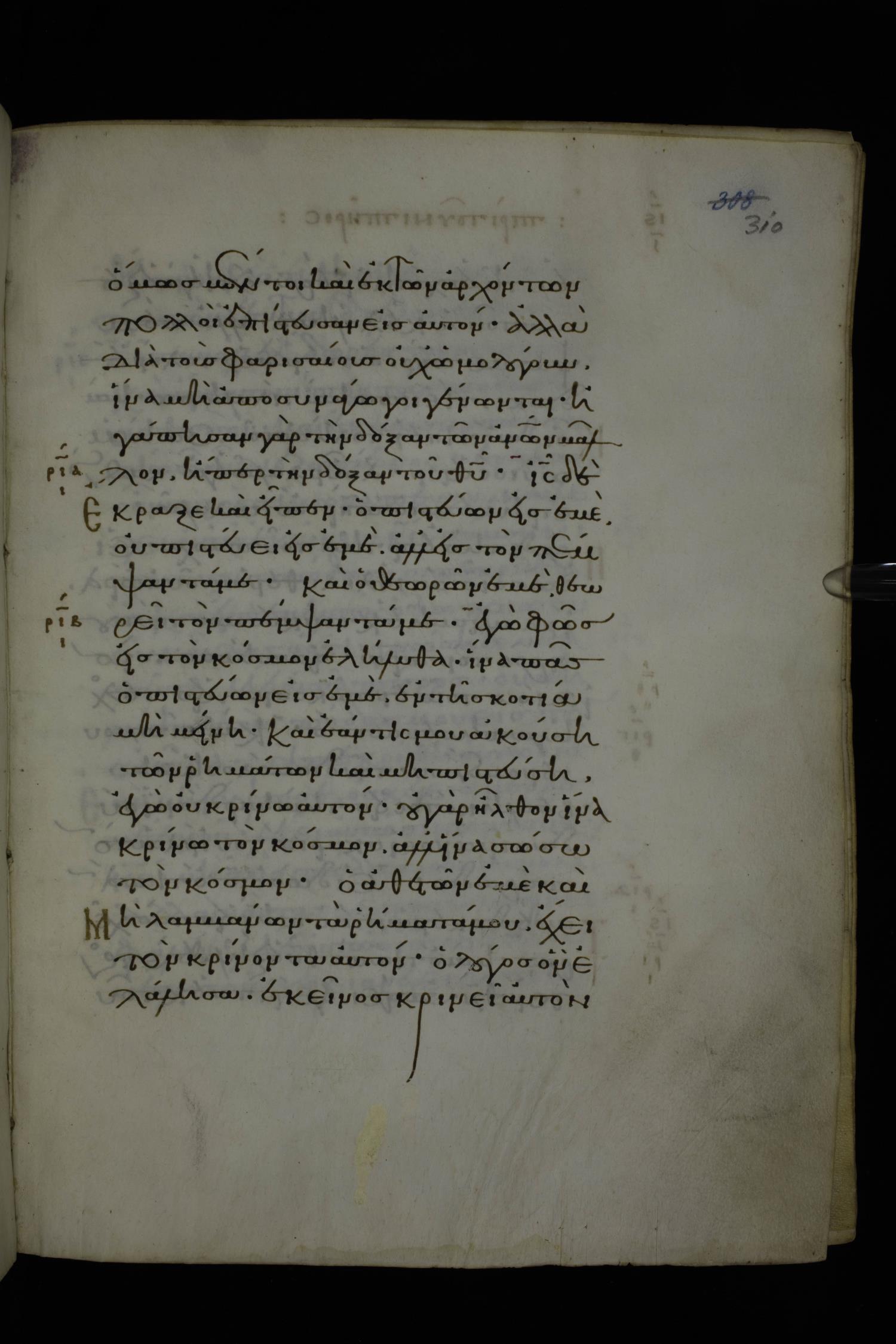 Eleventh century minuscule of Gospels on parchment; 370 leaves, 1 column, 20 lines per column. Images were taken at the National Library of Greece in Athens.