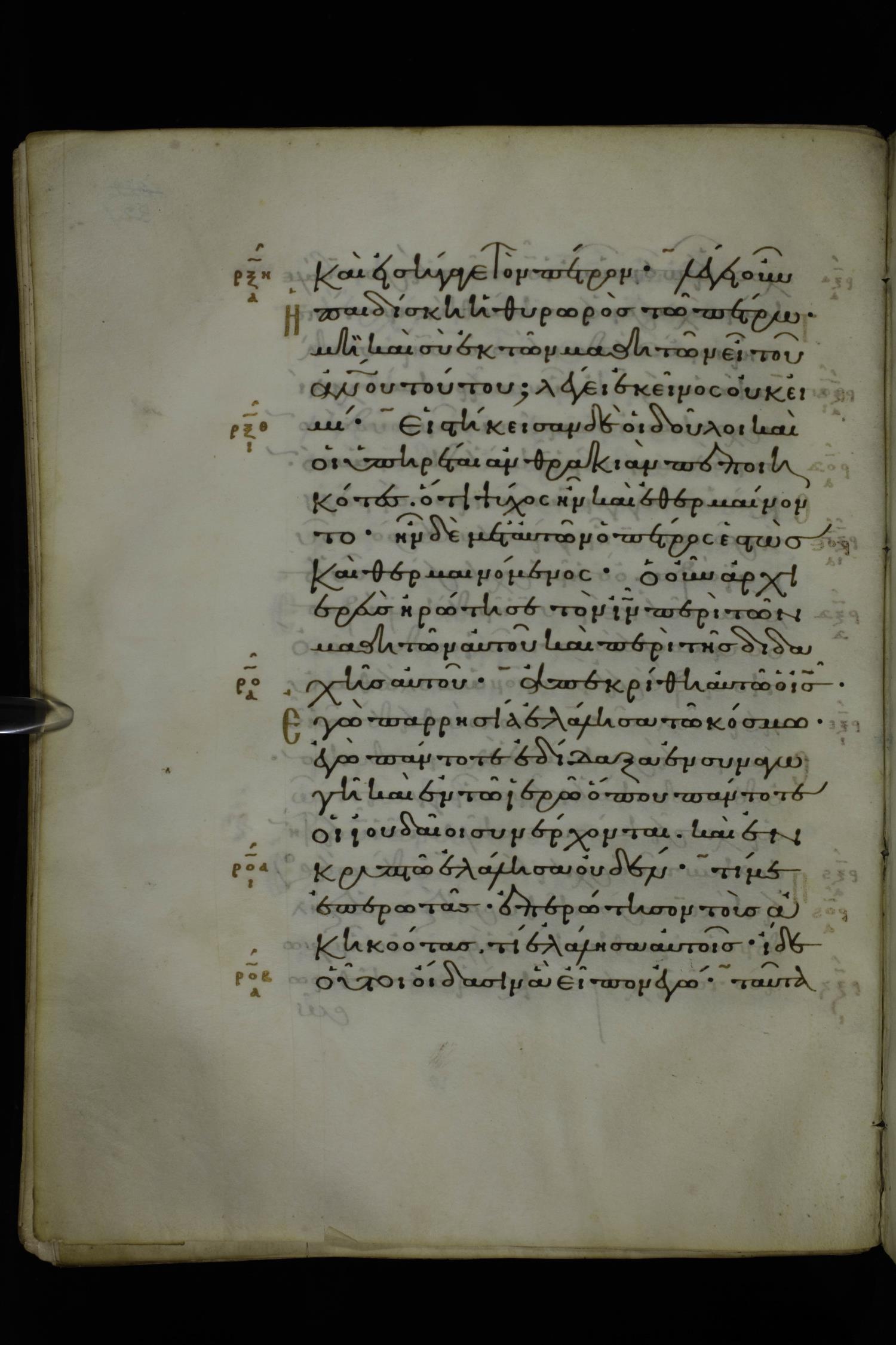 Eleventh century minuscule of Gospels on parchment; 370 leaves, 1 column, 20 lines per column. Images were taken at the National Library of Greece in Athens.