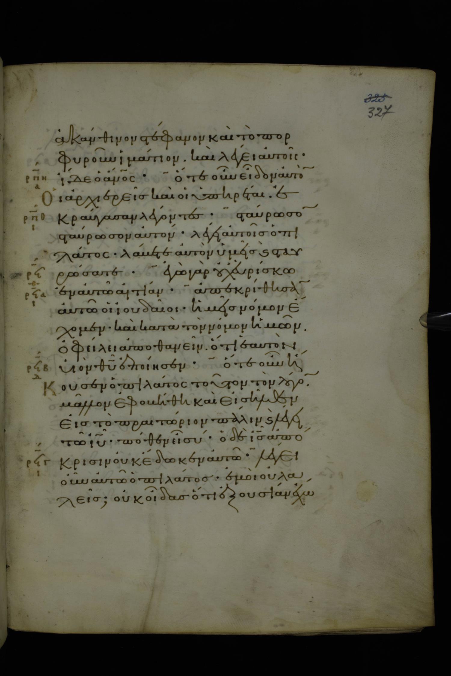 Eleventh century minuscule of Gospels on parchment; 370 leaves, 1 column, 20 lines per column. Images were taken at the National Library of Greece in Athens.