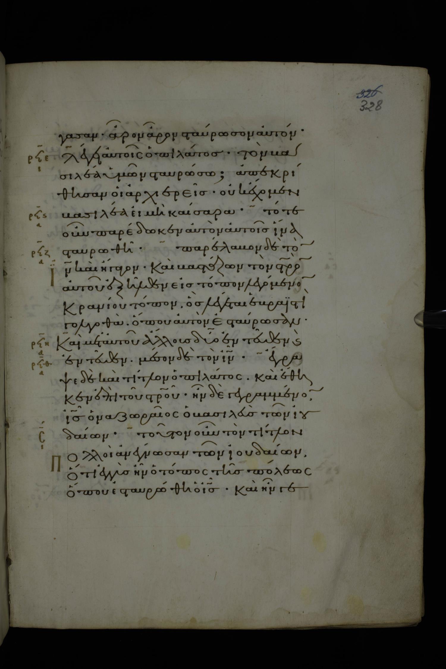 Eleventh century minuscule of Gospels on parchment; 370 leaves, 1 column, 20 lines per column. Images were taken at the National Library of Greece in Athens.