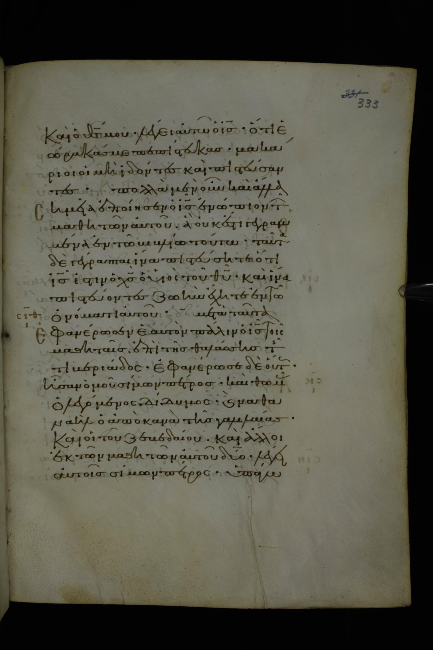 Eleventh century minuscule of Gospels on parchment; 370 leaves, 1 column, 20 lines per column. Images were taken at the National Library of Greece in Athens.
