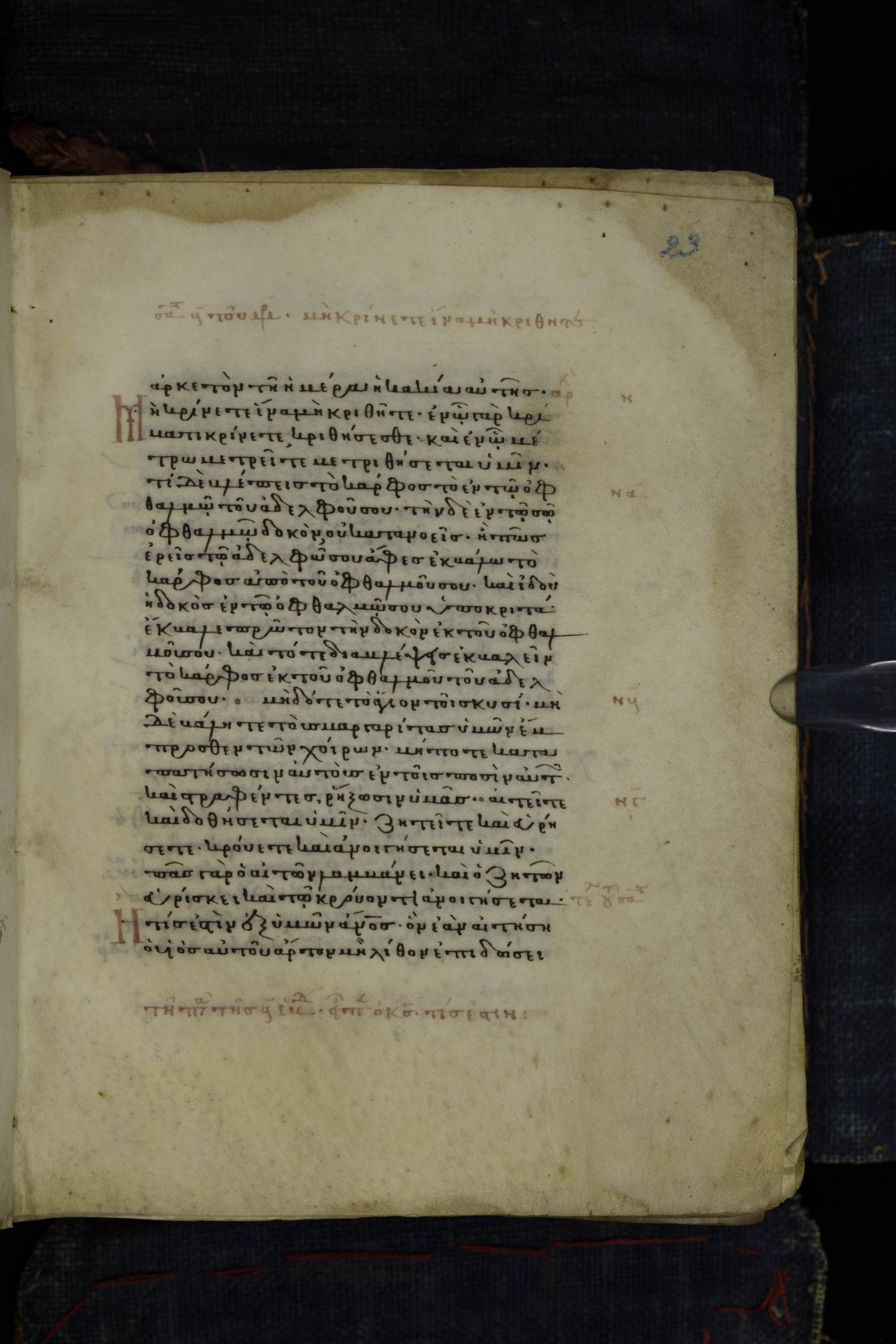 Thirteenth century minuscule of the Gospels on parchment; 223 leaves, 1 column, 24 lines per column. Images were taken at the National Library of Greece in Athens.