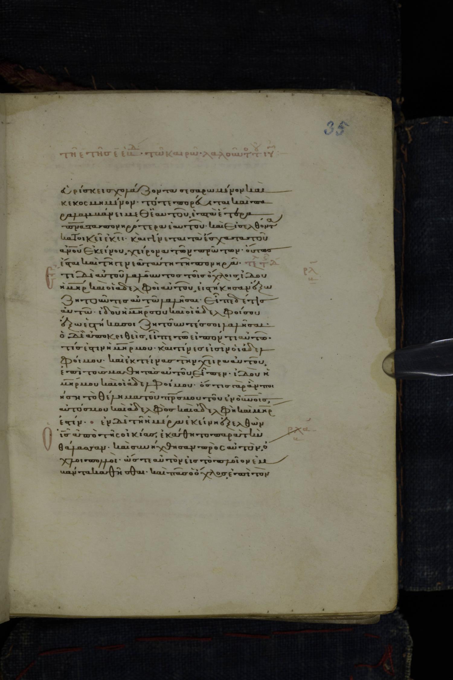 Thirteenth century minuscule of the Gospels on parchment; 223 leaves, 1 column, 24 lines per column. Images were taken at the National Library of Greece in Athens.