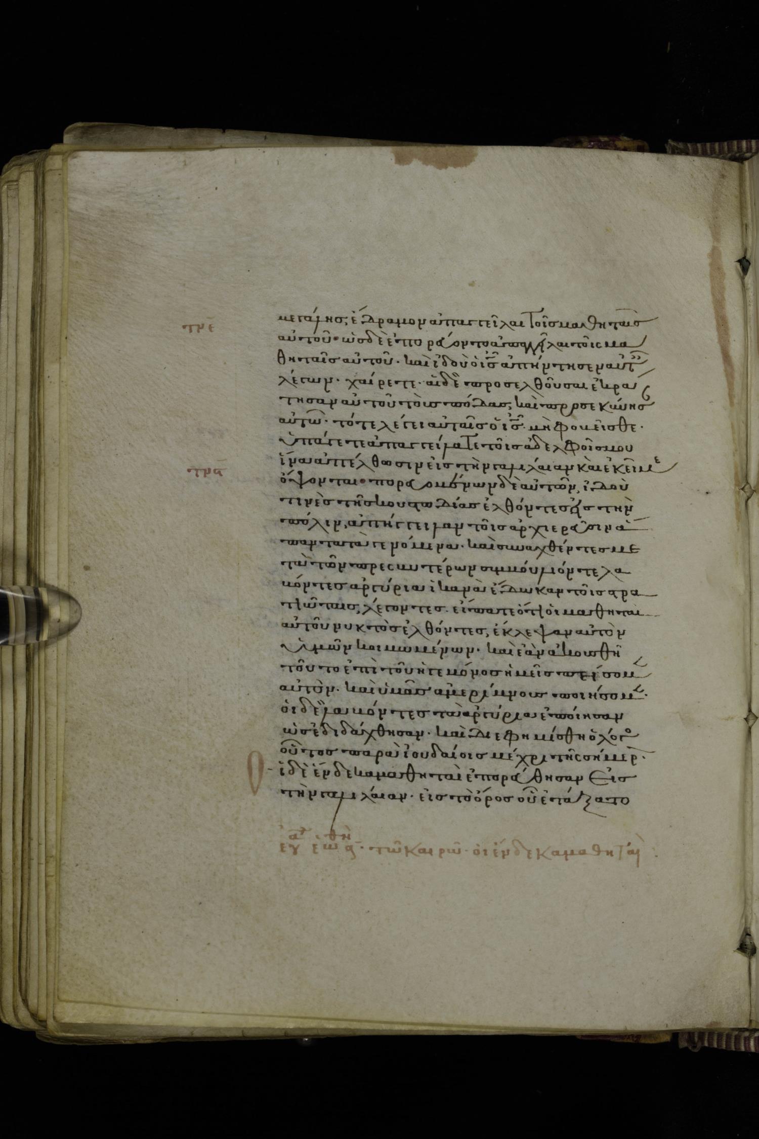 Thirteenth century minuscule of the Gospels on parchment; 223 leaves, 1 column, 24 lines per column. Images were taken at the National Library of Greece in Athens.