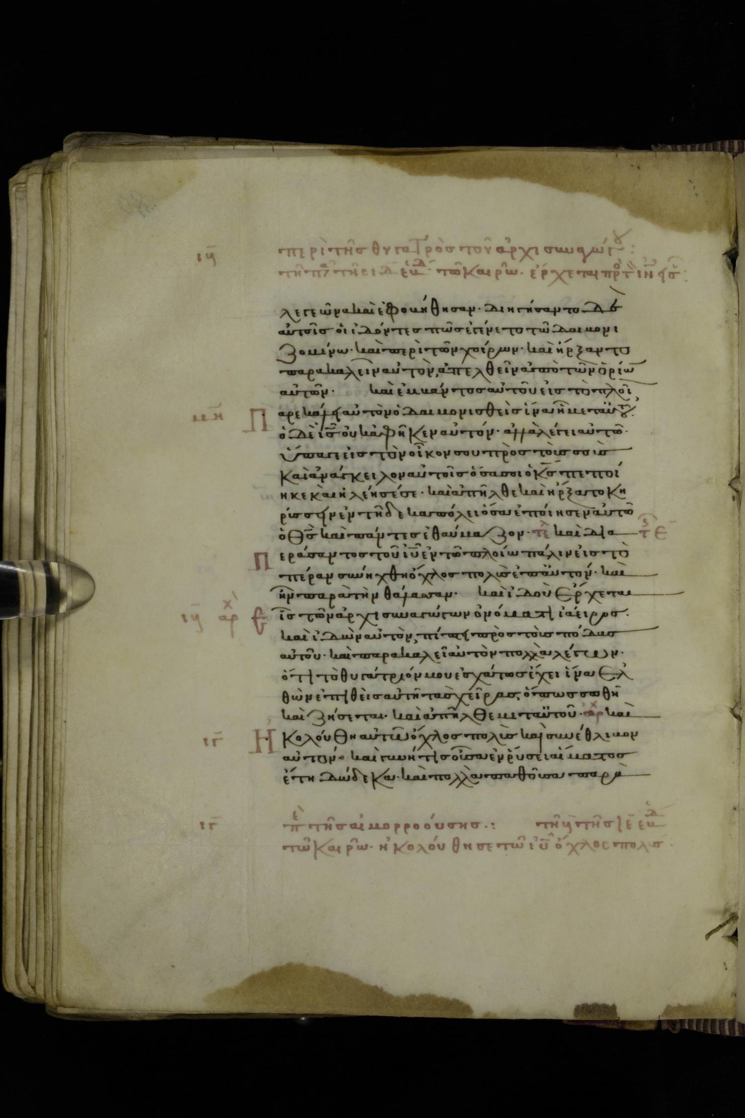 Thirteenth century minuscule of the Gospels on parchment; 223 leaves, 1 column, 24 lines per column. Images were taken at the National Library of Greece in Athens.