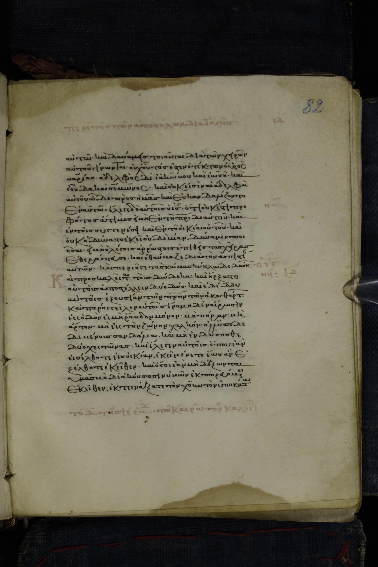 Thirteenth century minuscule of the Gospels on parchment; 223 leaves, 1 column, 24 lines per column. Images were taken at the National Library of Greece in Athens.
