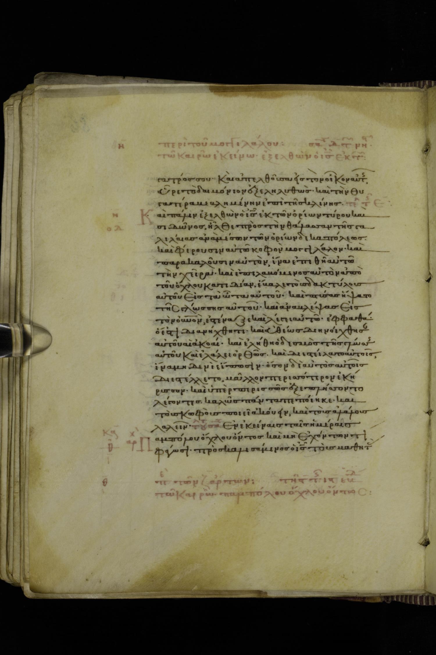 Thirteenth century minuscule of the Gospels on parchment; 223 leaves, 1 column, 24 lines per column. Images were taken at the National Library of Greece in Athens.