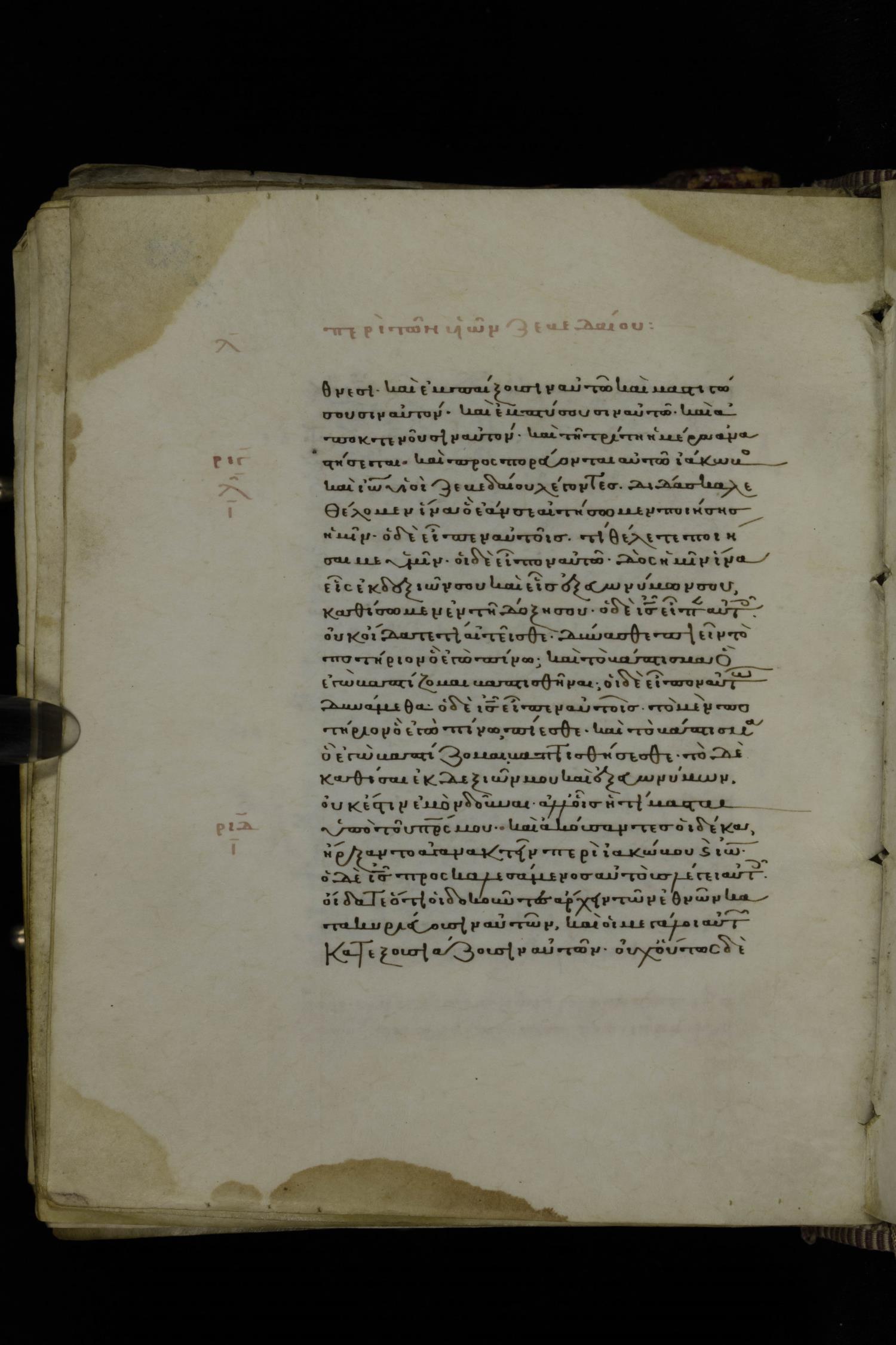 Thirteenth century minuscule of the Gospels on parchment; 223 leaves, 1 column, 24 lines per column. Images were taken at the National Library of Greece in Athens.