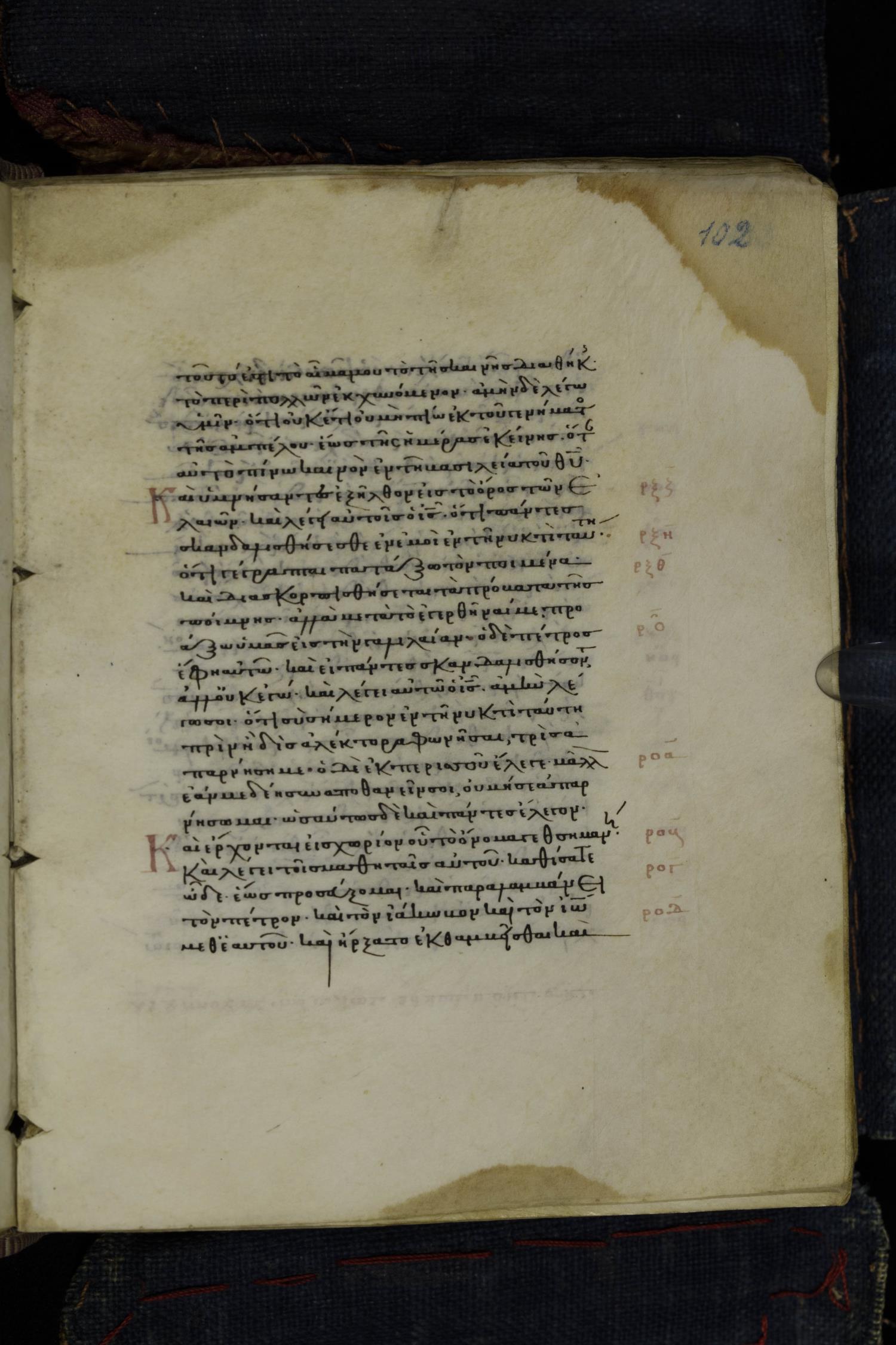 Thirteenth century minuscule of the Gospels on parchment; 223 leaves, 1 column, 24 lines per column. Images were taken at the National Library of Greece in Athens.