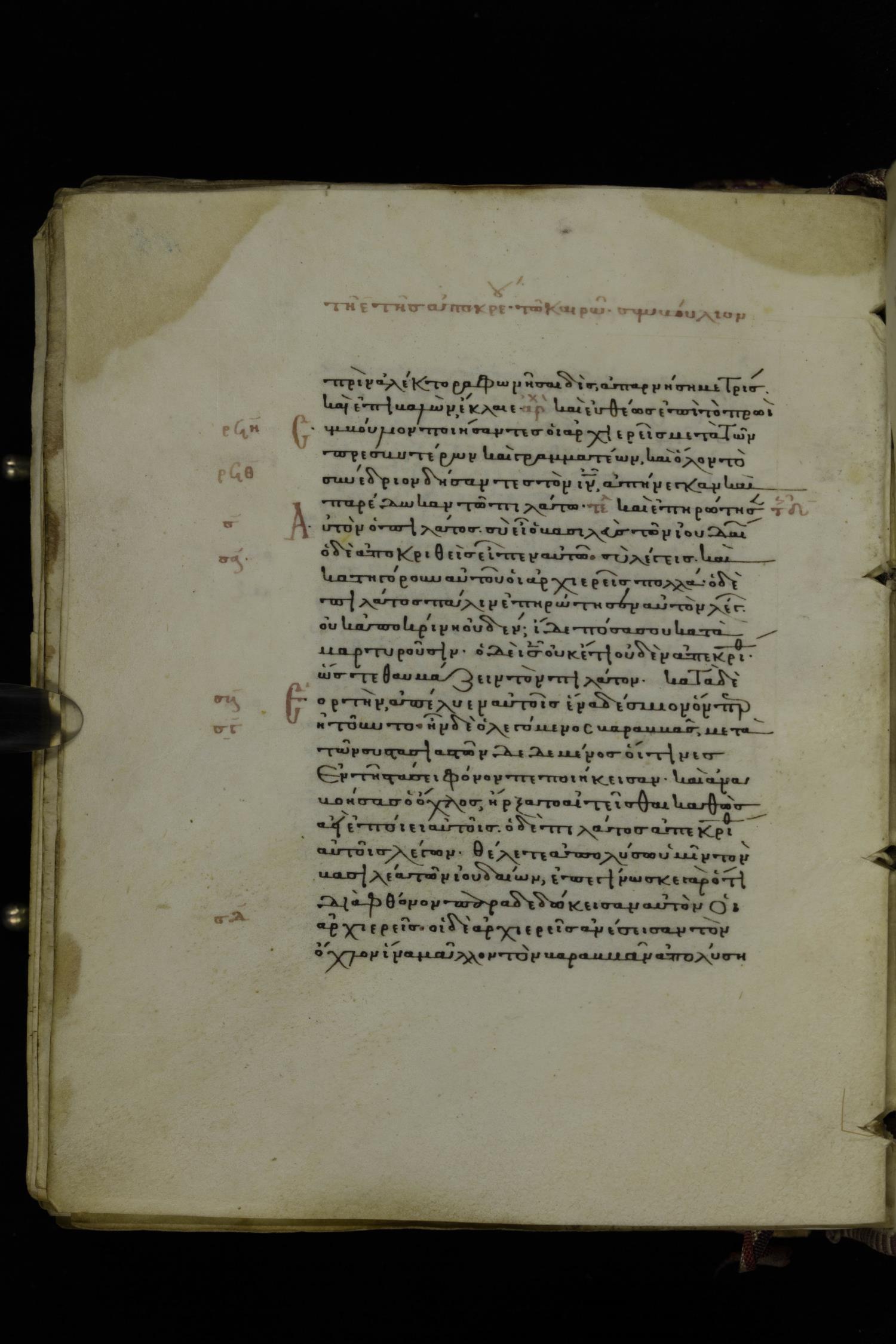 Thirteenth century minuscule of the Gospels on parchment; 223 leaves, 1 column, 24 lines per column. Images were taken at the National Library of Greece in Athens.