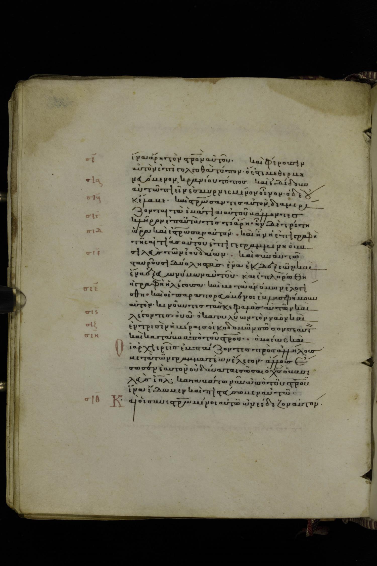 Thirteenth century minuscule of the Gospels on parchment; 223 leaves, 1 column, 24 lines per column. Images were taken at the National Library of Greece in Athens.