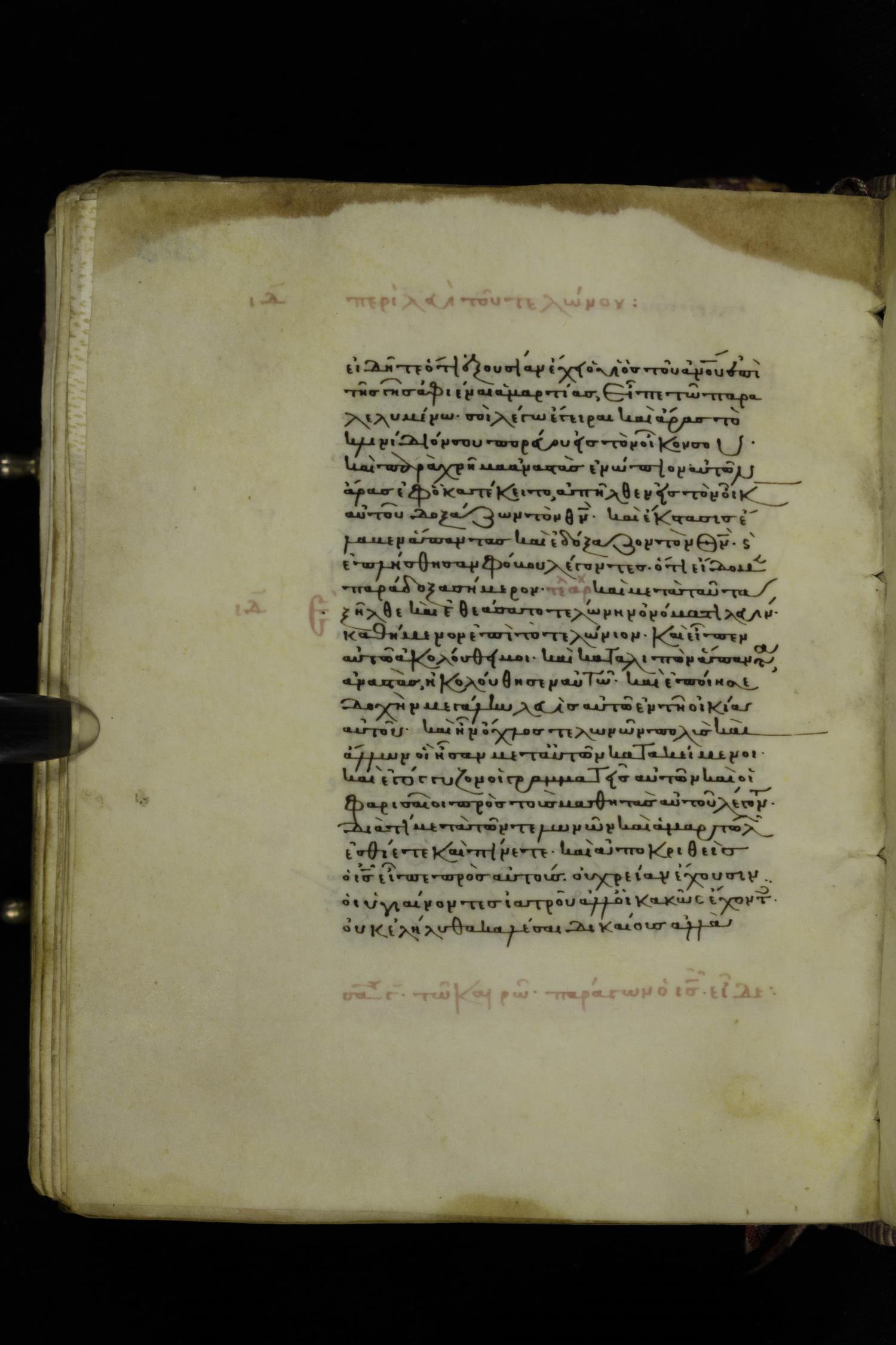 Thirteenth century minuscule of the Gospels on parchment; 223 leaves, 1 column, 24 lines per column. Images were taken at the National Library of Greece in Athens.