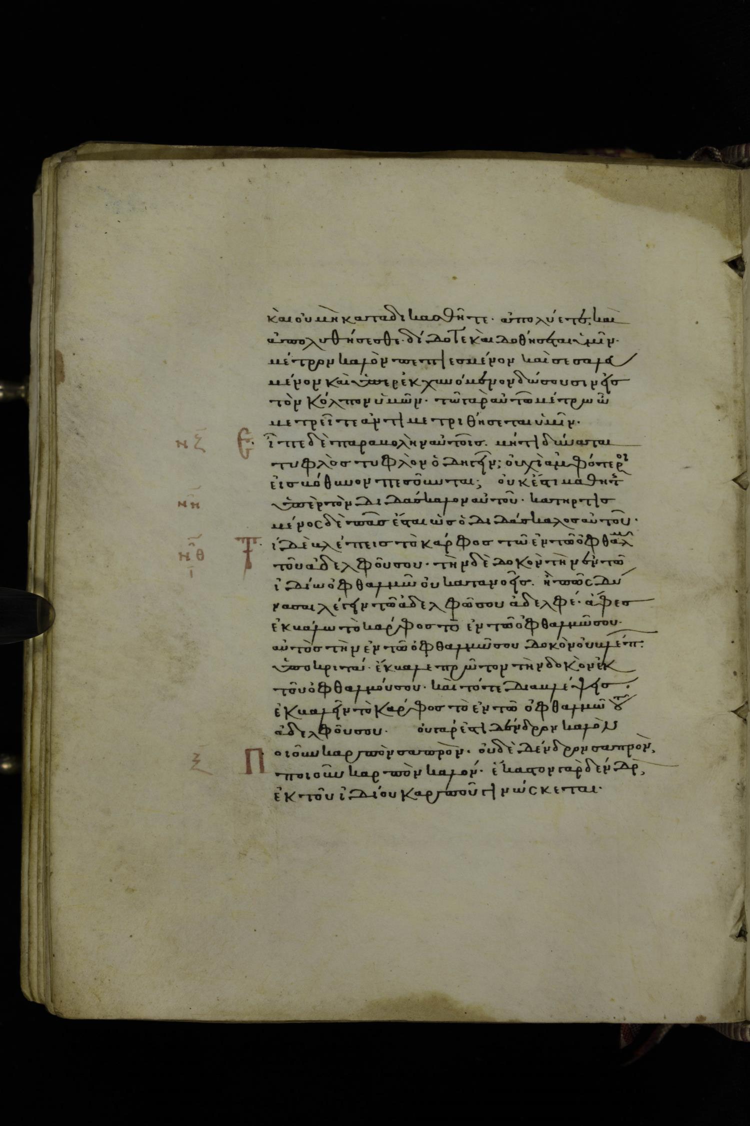 Thirteenth century minuscule of the Gospels on parchment; 223 leaves, 1 column, 24 lines per column. Images were taken at the National Library of Greece in Athens.