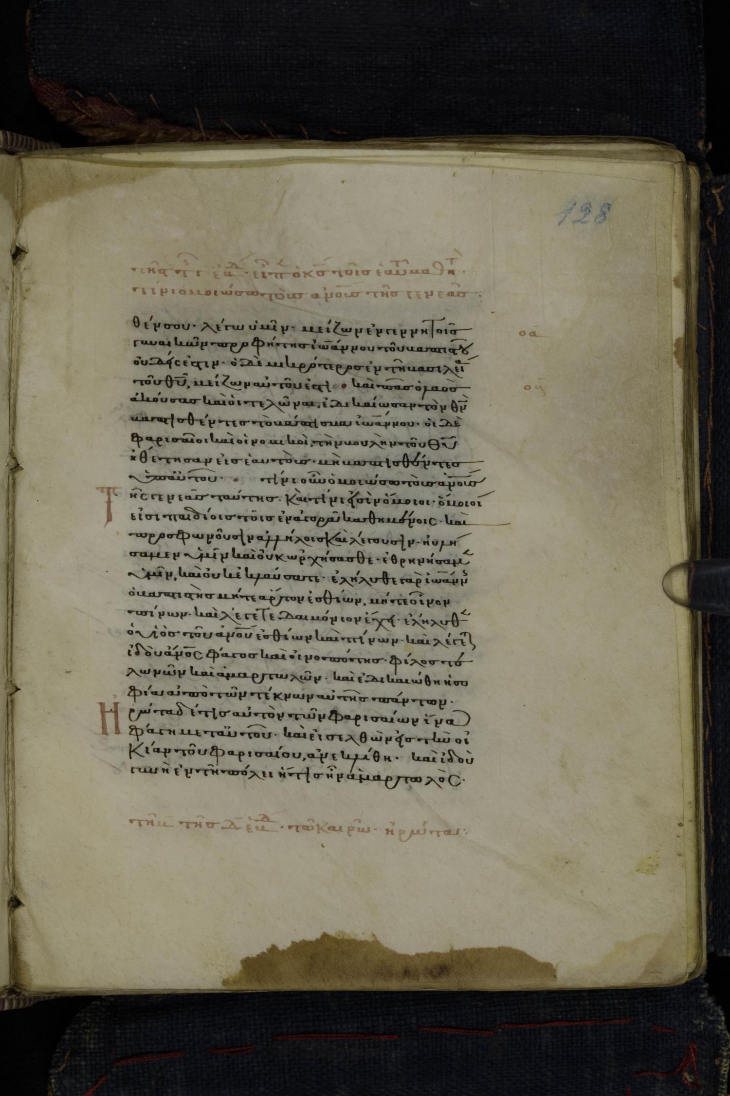 Thirteenth century minuscule of the Gospels on parchment; 223 leaves, 1 column, 24 lines per column. Images were taken at the National Library of Greece in Athens.