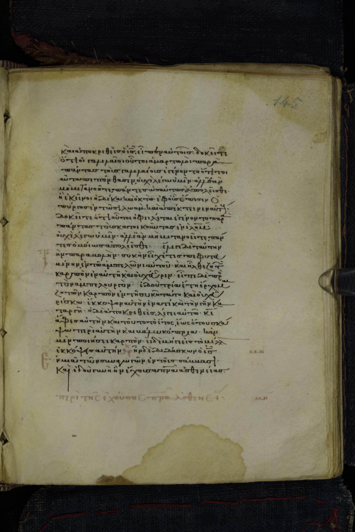 Thirteenth century minuscule of the Gospels on parchment; 223 leaves, 1 column, 24 lines per column. Images were taken at the National Library of Greece in Athens.
