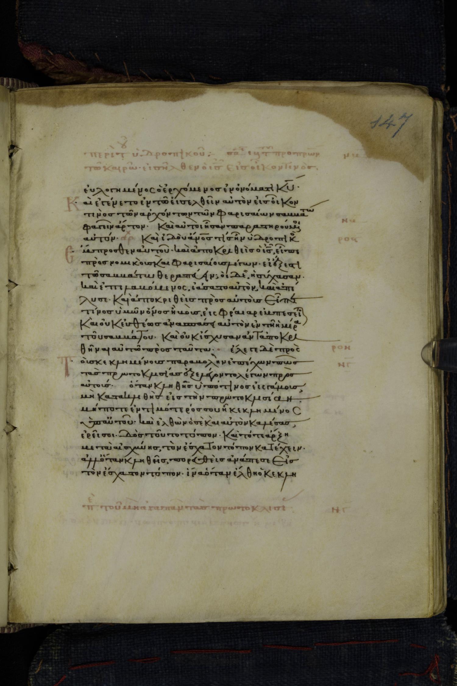 Thirteenth century minuscule of the Gospels on parchment; 223 leaves, 1 column, 24 lines per column. Images were taken at the National Library of Greece in Athens.