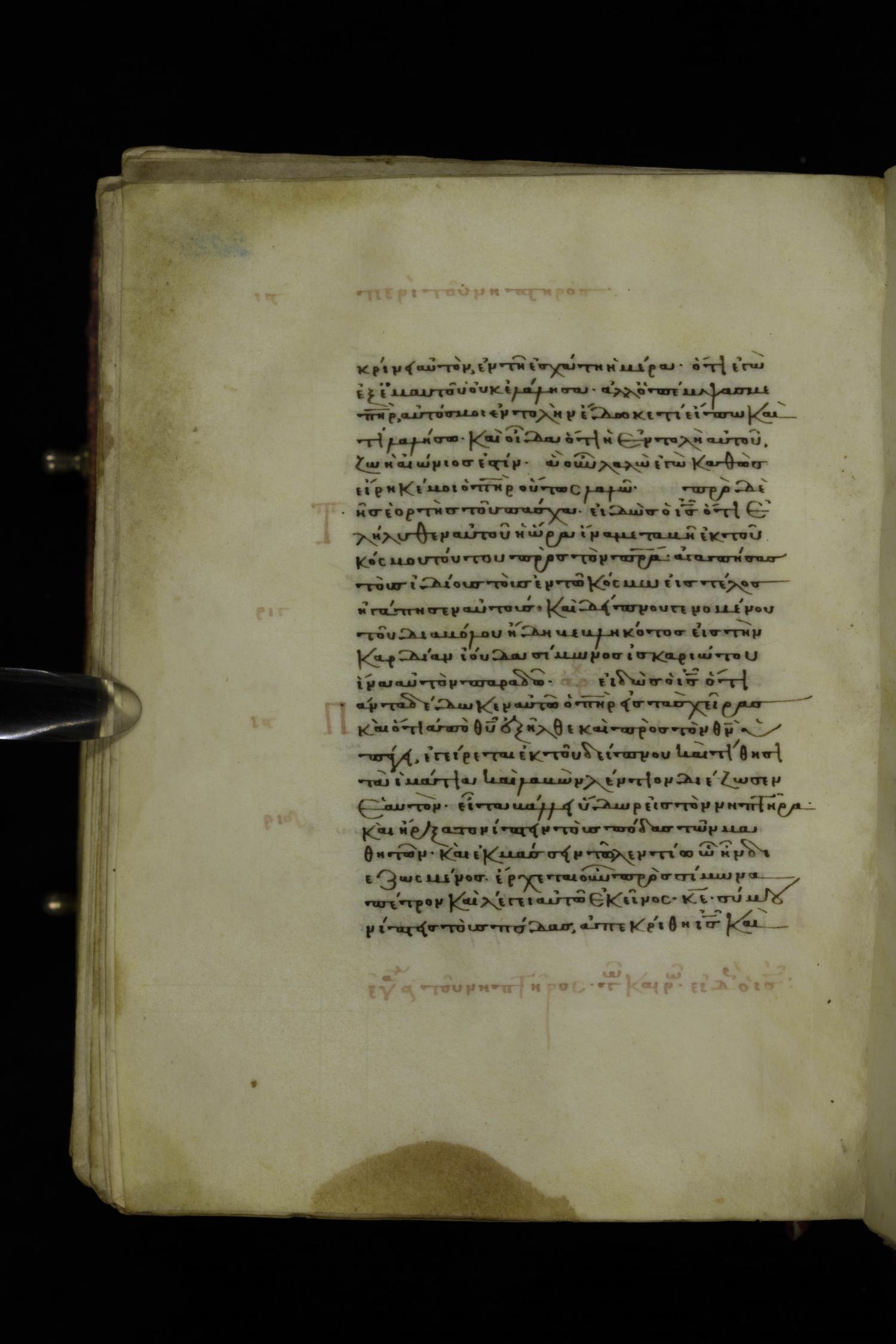 Thirteenth century minuscule of the Gospels on parchment; 223 leaves, 1 column, 24 lines per column. Images were taken at the National Library of Greece in Athens.