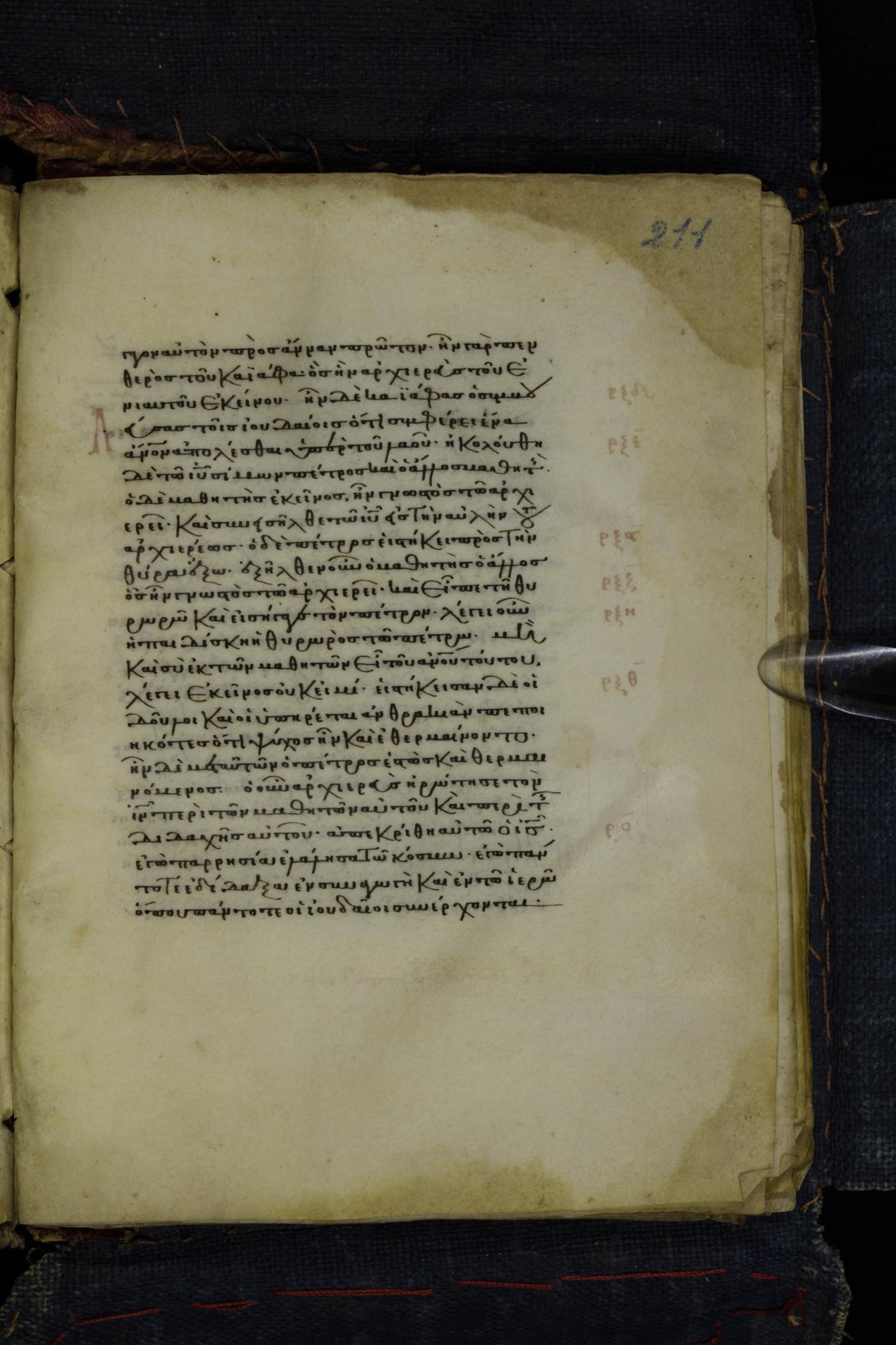 Thirteenth century minuscule of the Gospels on parchment; 223 leaves, 1 column, 24 lines per column. Images were taken at the National Library of Greece in Athens.