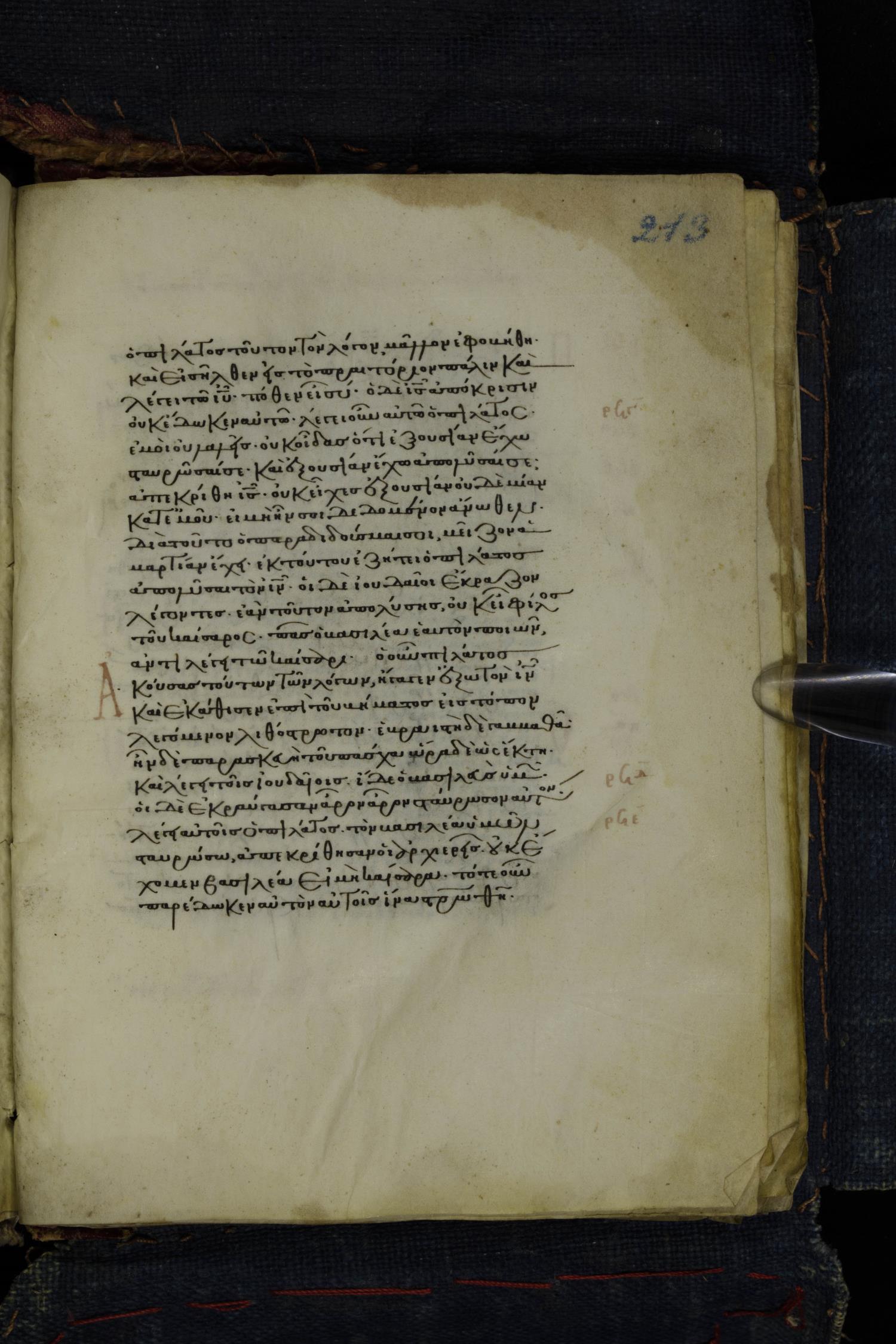 Thirteenth century minuscule of the Gospels on parchment; 223 leaves, 1 column, 24 lines per column. Images were taken at the National Library of Greece in Athens.