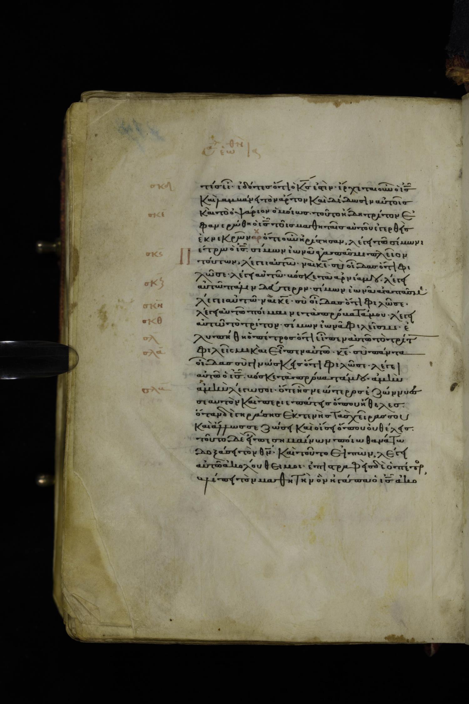 Thirteenth century minuscule of the Gospels on parchment; 223 leaves, 1 column, 24 lines per column. Images were taken at the National Library of Greece in Athens.