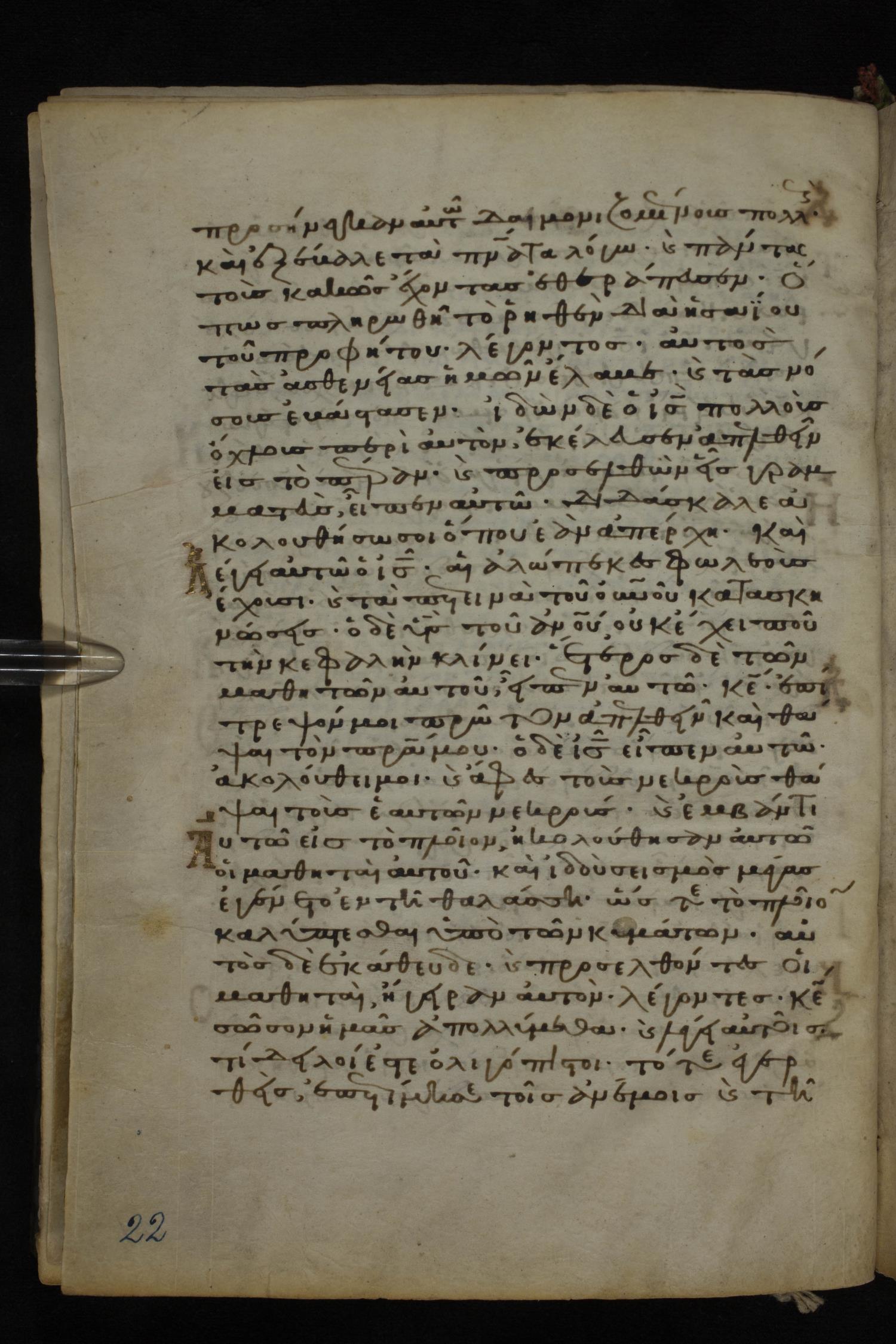 Twelfth century minuscule of the Gospels on parchment; 185 leaves, 1 column, 29 lines per column. Images were taken at the National Library of Greece in Athens.