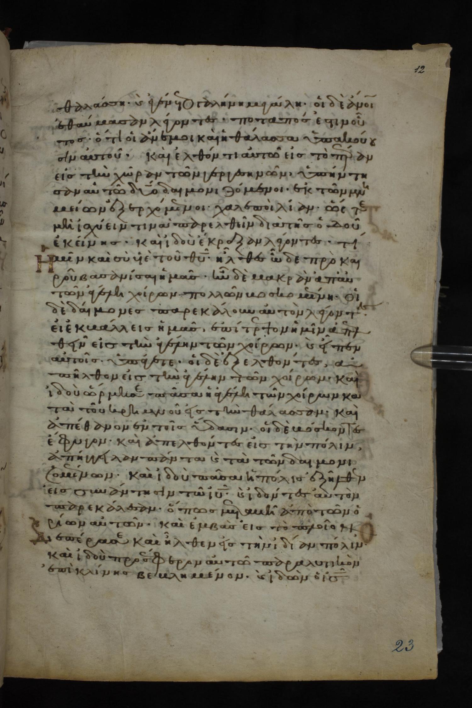 Twelfth century minuscule of the Gospels on parchment; 185 leaves, 1 column, 29 lines per column. Images were taken at the National Library of Greece in Athens.