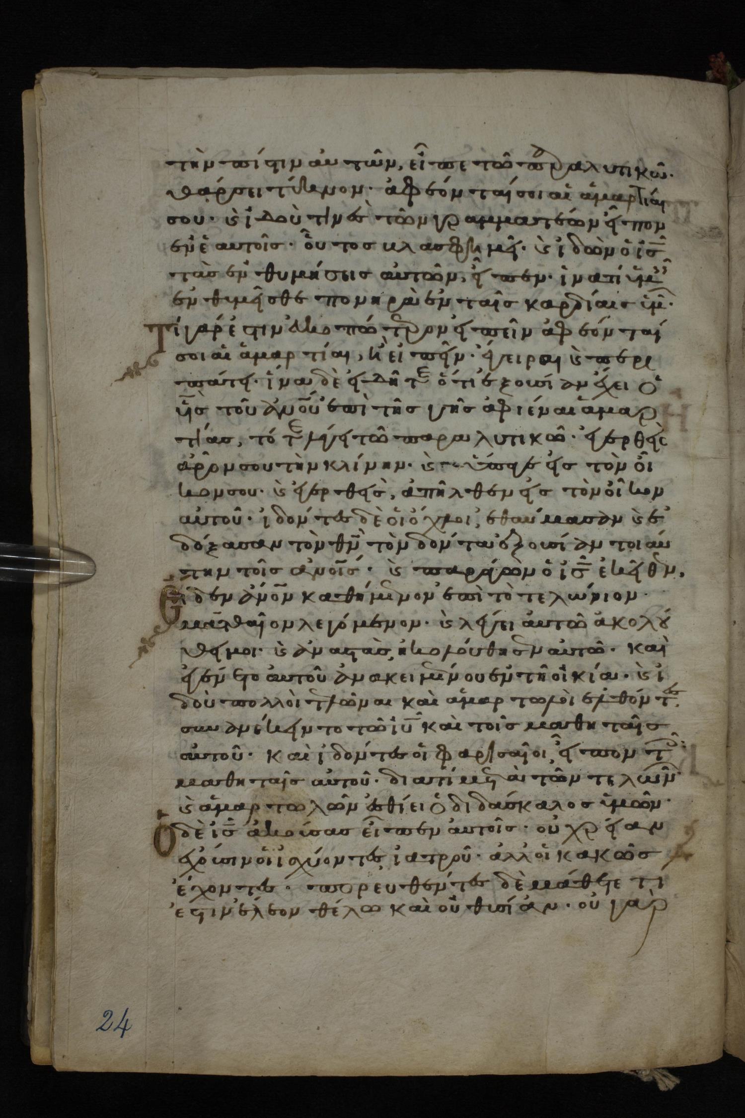 Twelfth century minuscule of the Gospels on parchment; 185 leaves, 1 column, 29 lines per column. Images were taken at the National Library of Greece in Athens.