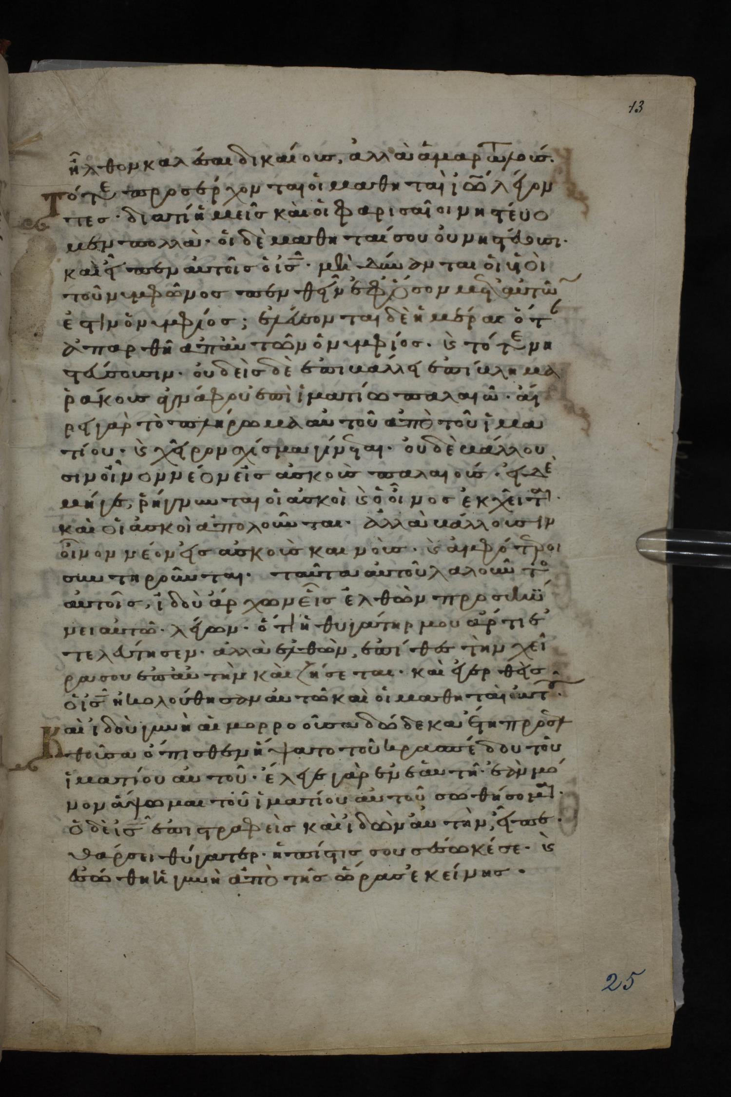 Twelfth century minuscule of the Gospels on parchment; 185 leaves, 1 column, 29 lines per column. Images were taken at the National Library of Greece in Athens.