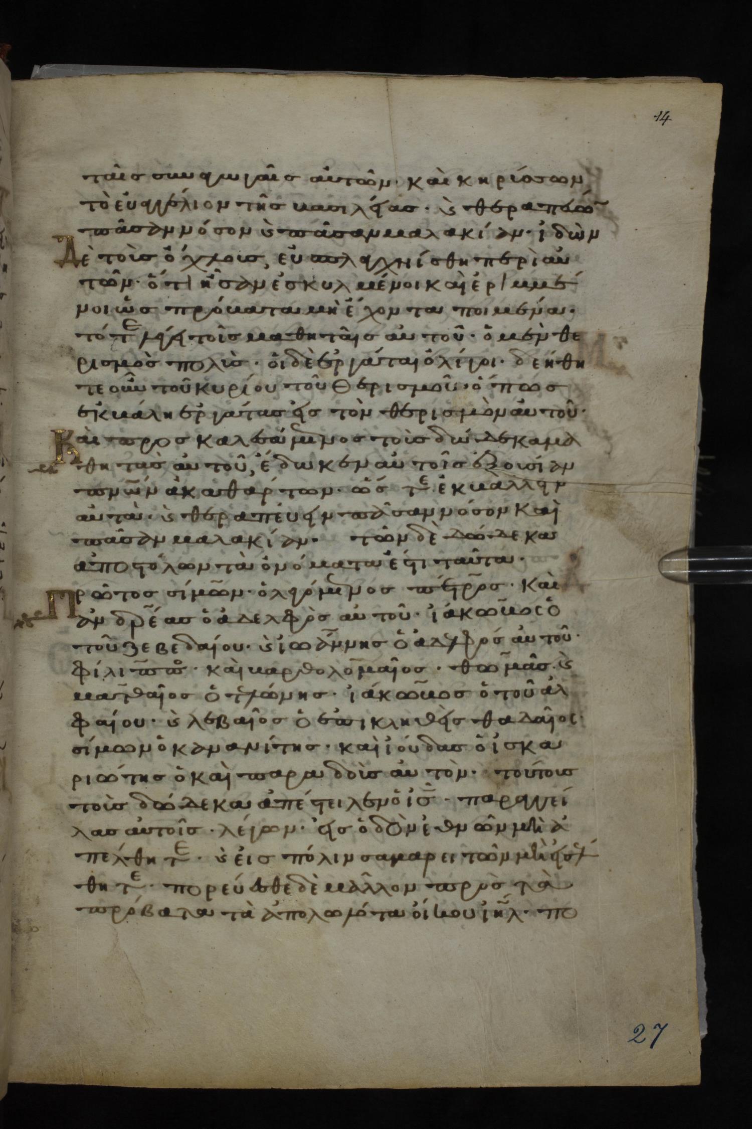 Twelfth century minuscule of the Gospels on parchment; 185 leaves, 1 column, 29 lines per column. Images were taken at the National Library of Greece in Athens.