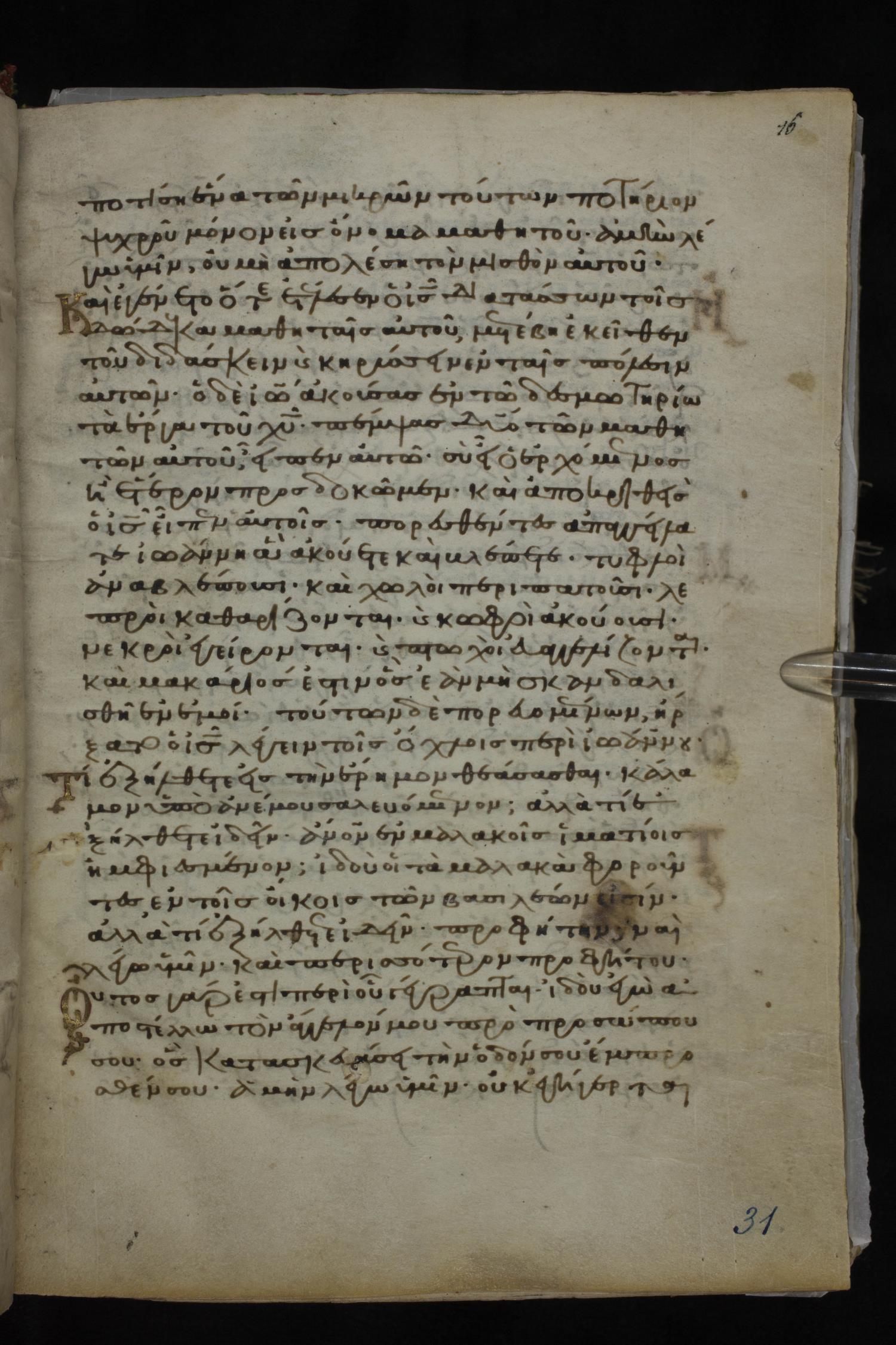 Twelfth century minuscule of the Gospels on parchment; 185 leaves, 1 column, 29 lines per column. Images were taken at the National Library of Greece in Athens.
