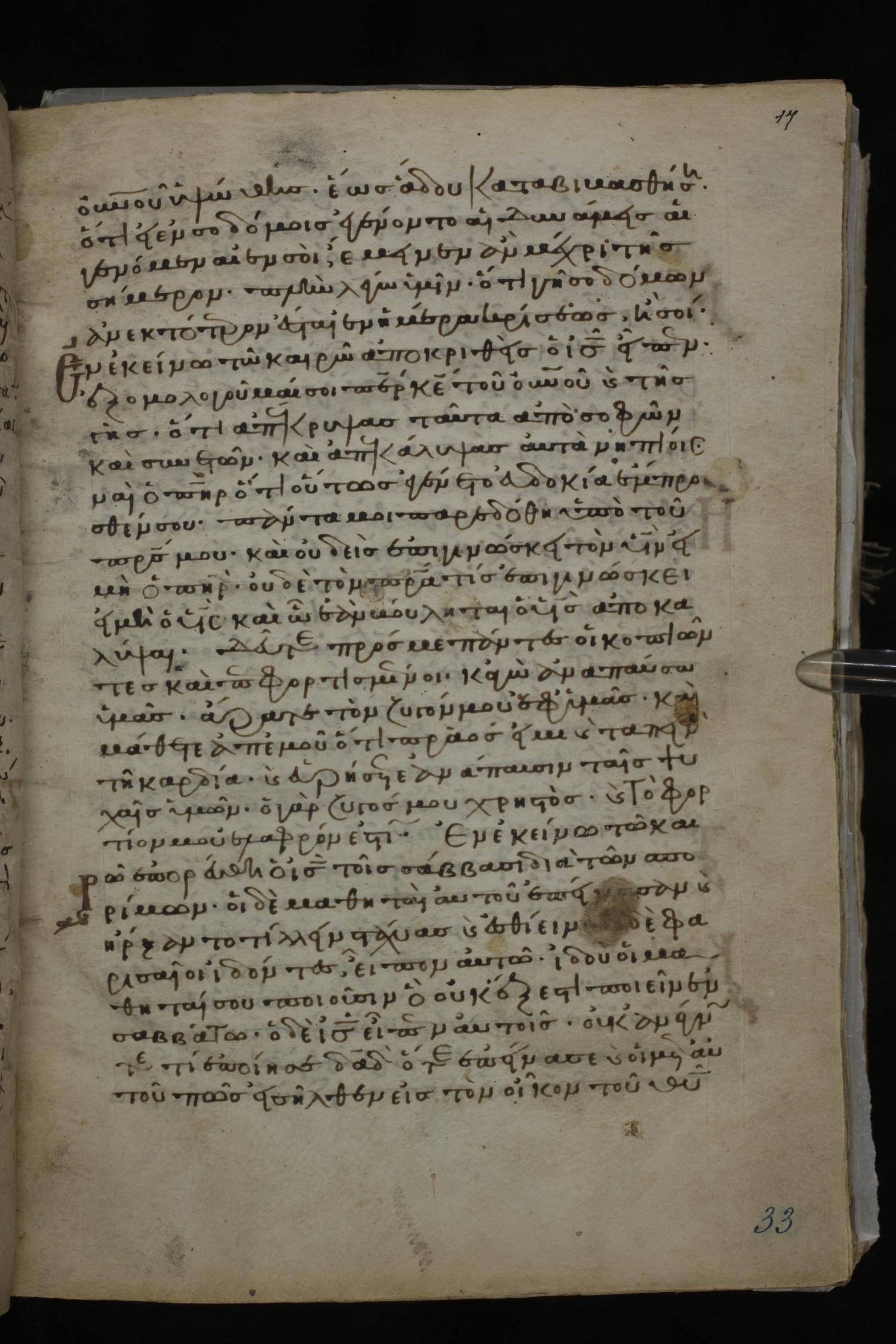 Twelfth century minuscule of the Gospels on parchment; 185 leaves, 1 column, 29 lines per column. Images were taken at the National Library of Greece in Athens.