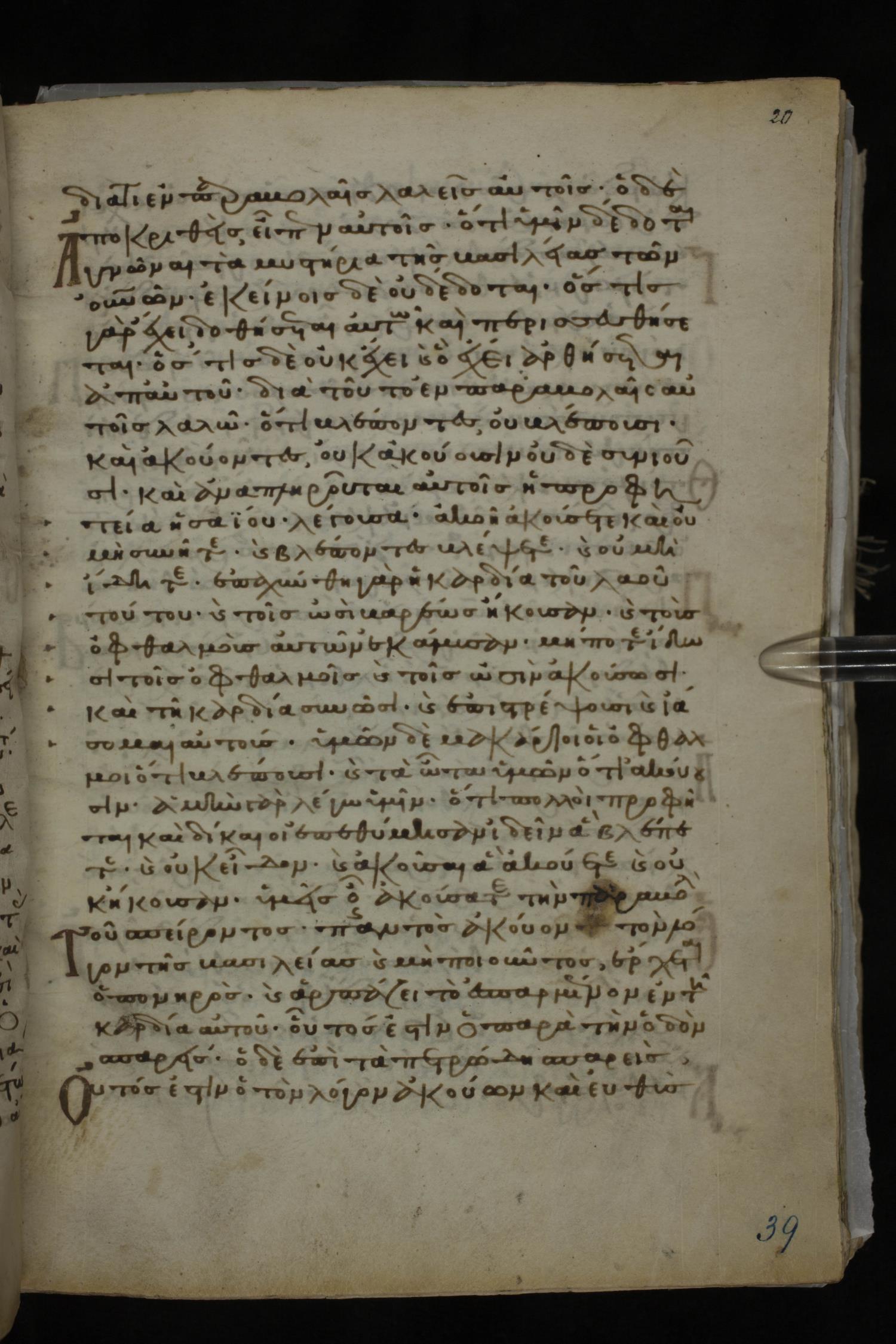 Twelfth century minuscule of the Gospels on parchment; 185 leaves, 1 column, 29 lines per column. Images were taken at the National Library of Greece in Athens.