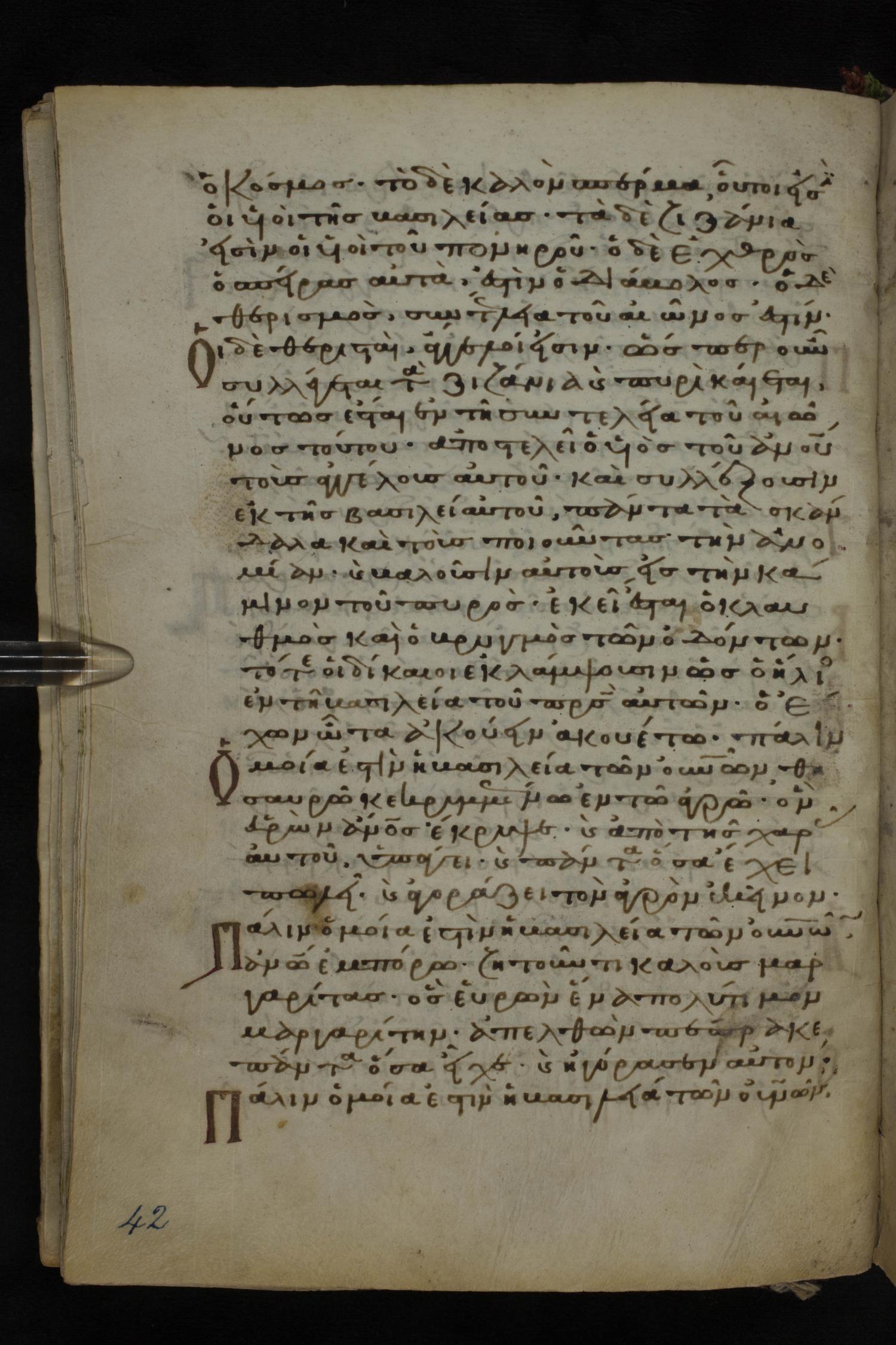 Twelfth century minuscule of the Gospels on parchment; 185 leaves, 1 column, 29 lines per column. Images were taken at the National Library of Greece in Athens.