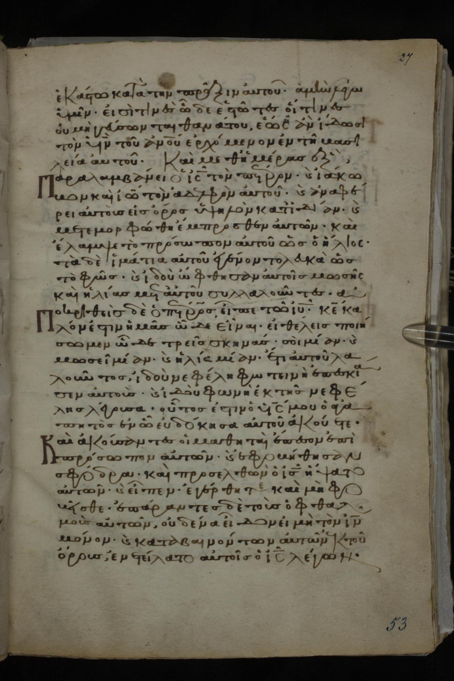 Twelfth century minuscule of the Gospels on parchment; 185 leaves, 1 column, 29 lines per column. Images were taken at the National Library of Greece in Athens.