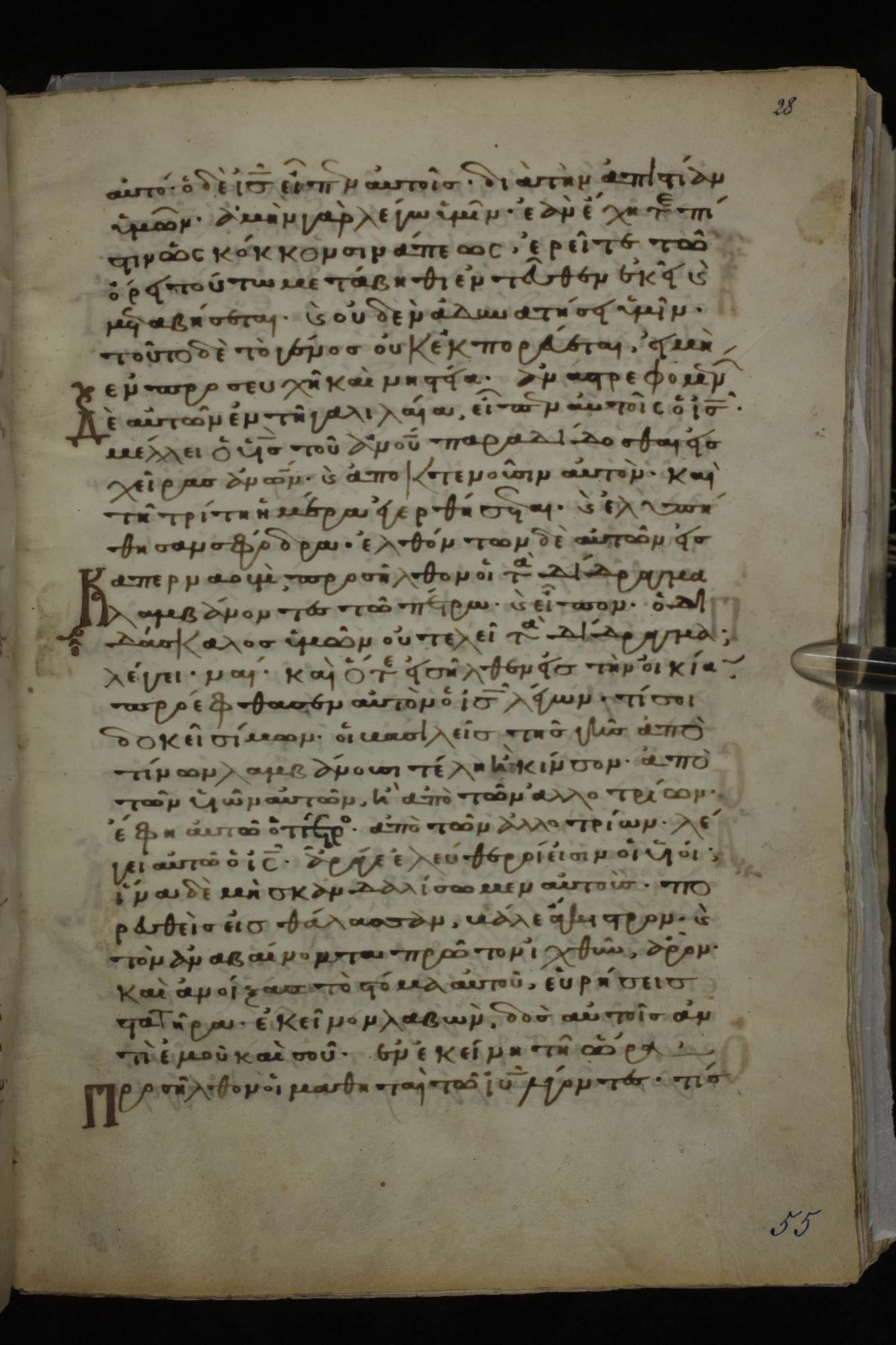 Twelfth century minuscule of the Gospels on parchment; 185 leaves, 1 column, 29 lines per column. Images were taken at the National Library of Greece in Athens.