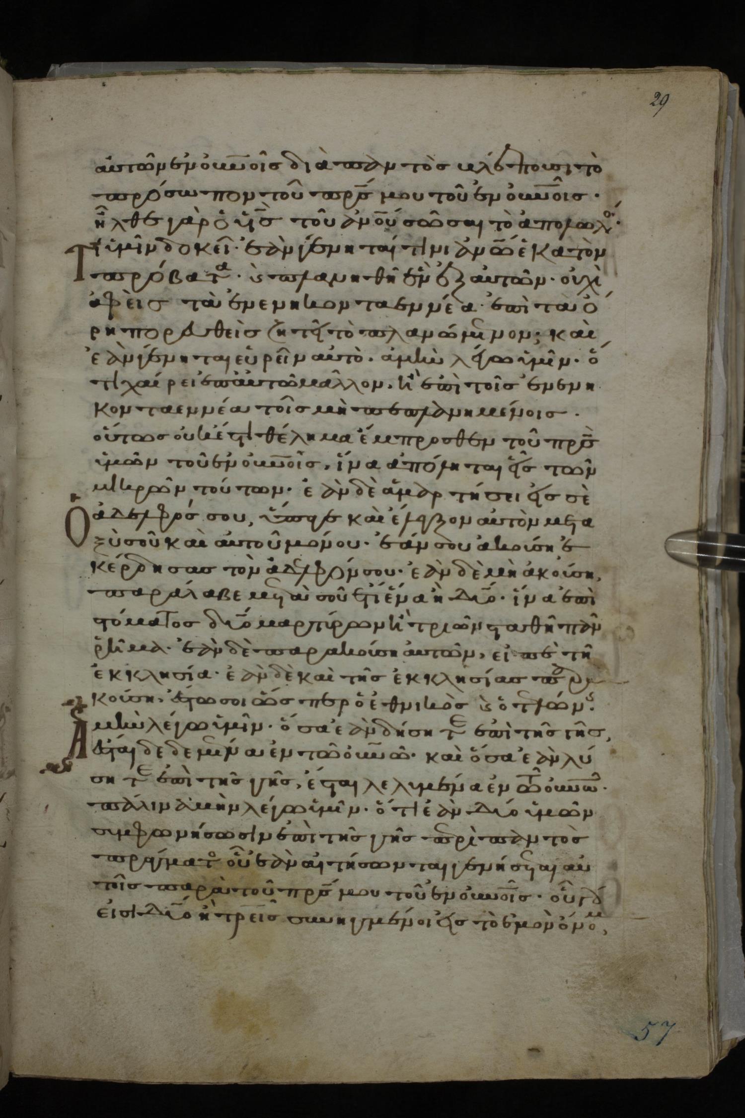Twelfth century minuscule of the Gospels on parchment; 185 leaves, 1 column, 29 lines per column. Images were taken at the National Library of Greece in Athens.