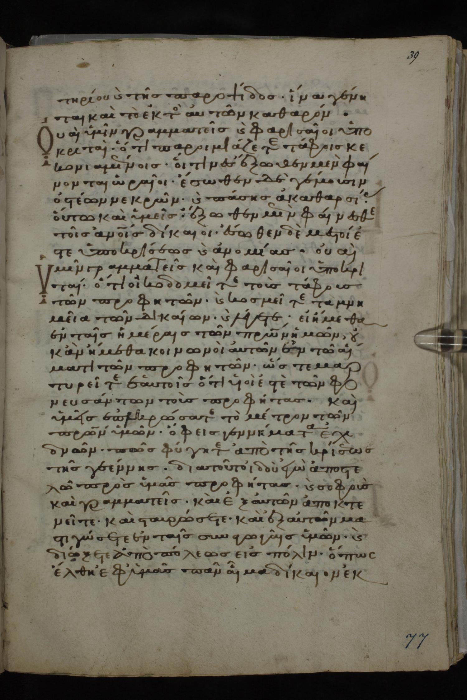 Twelfth century minuscule of the Gospels on parchment; 185 leaves, 1 column, 29 lines per column. Images were taken at the National Library of Greece in Athens.