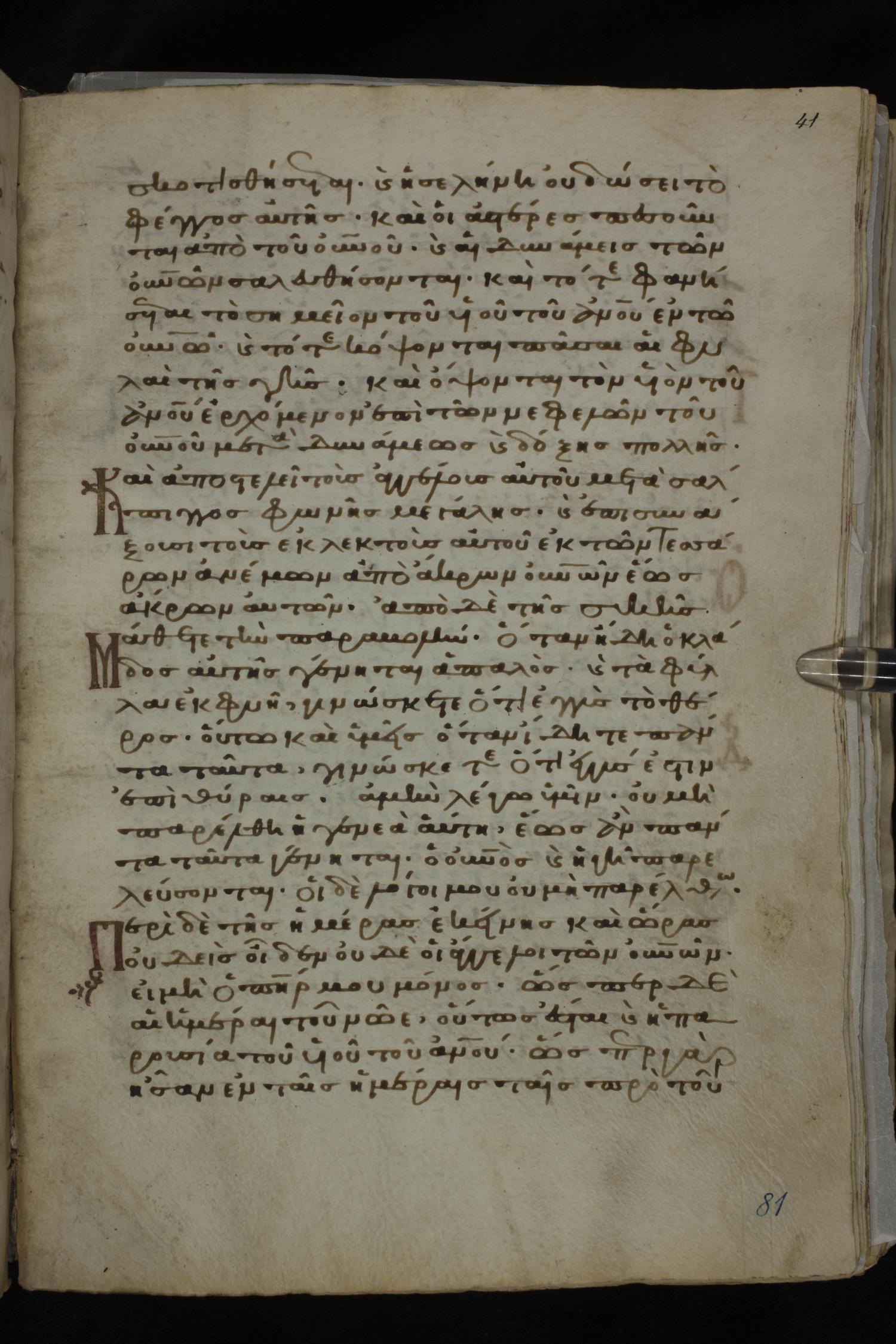 Twelfth century minuscule of the Gospels on parchment; 185 leaves, 1 column, 29 lines per column. Images were taken at the National Library of Greece in Athens.
