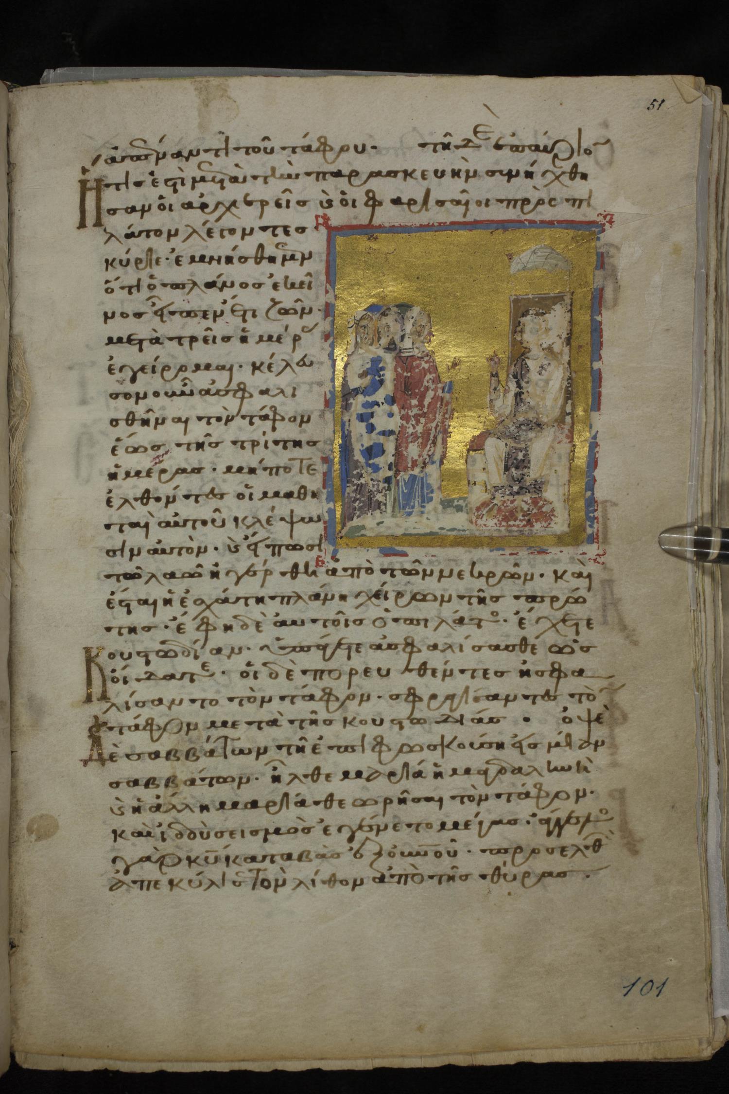Twelfth century minuscule of the Gospels on parchment; 185 leaves, 1 column, 29 lines per column. Images were taken at the National Library of Greece in Athens.