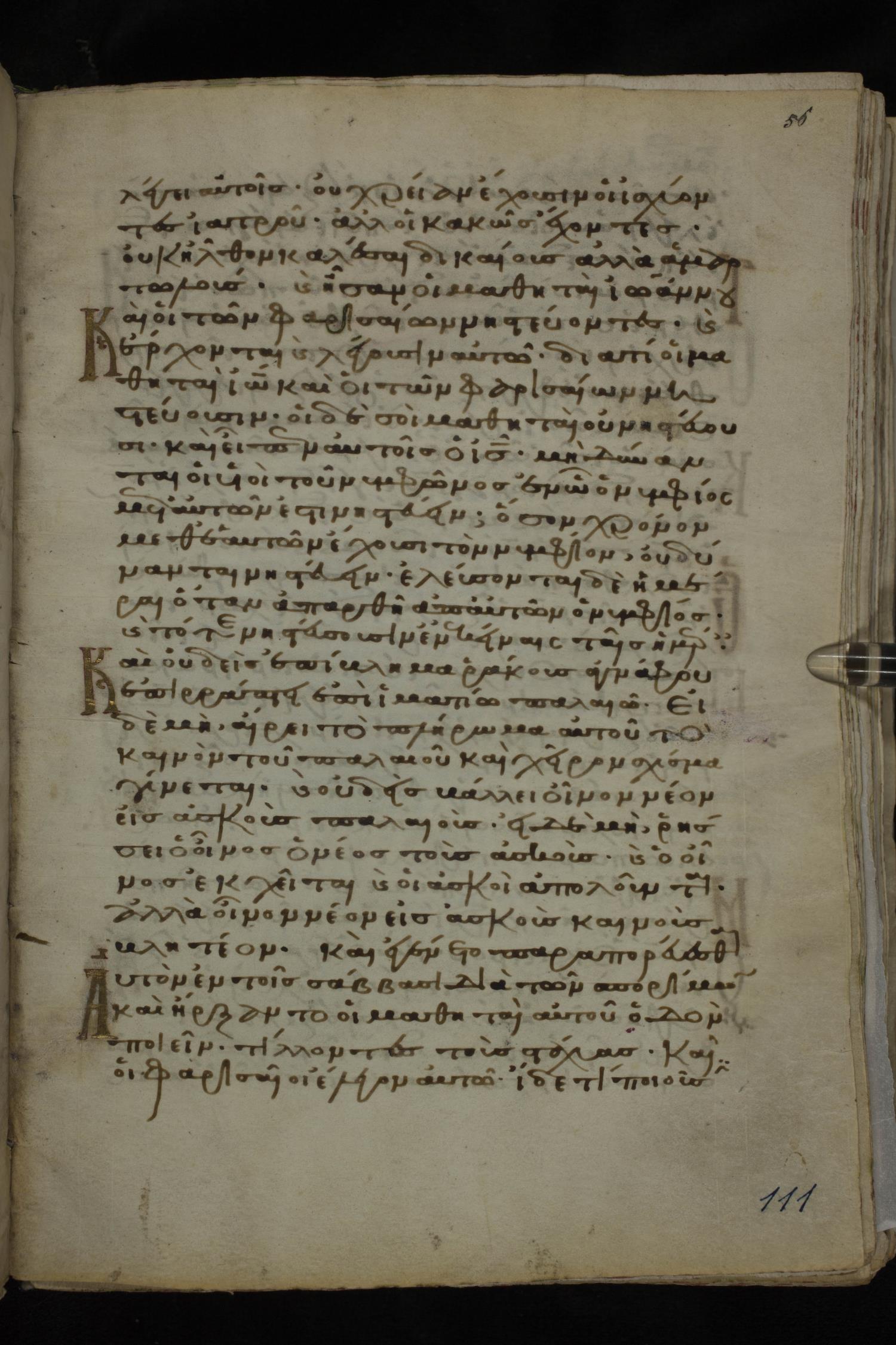 Twelfth century minuscule of the Gospels on parchment; 185 leaves, 1 column, 29 lines per column. Images were taken at the National Library of Greece in Athens.