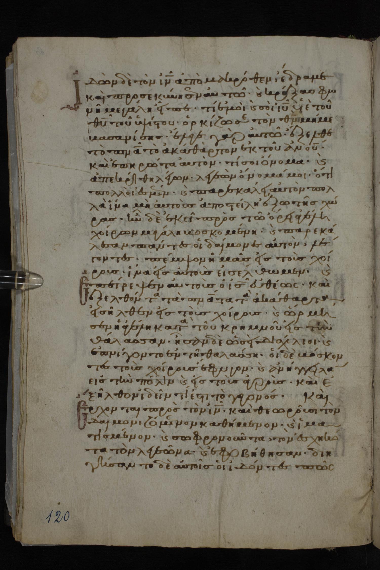 Twelfth century minuscule of the Gospels on parchment; 185 leaves, 1 column, 29 lines per column. Images were taken at the National Library of Greece in Athens.