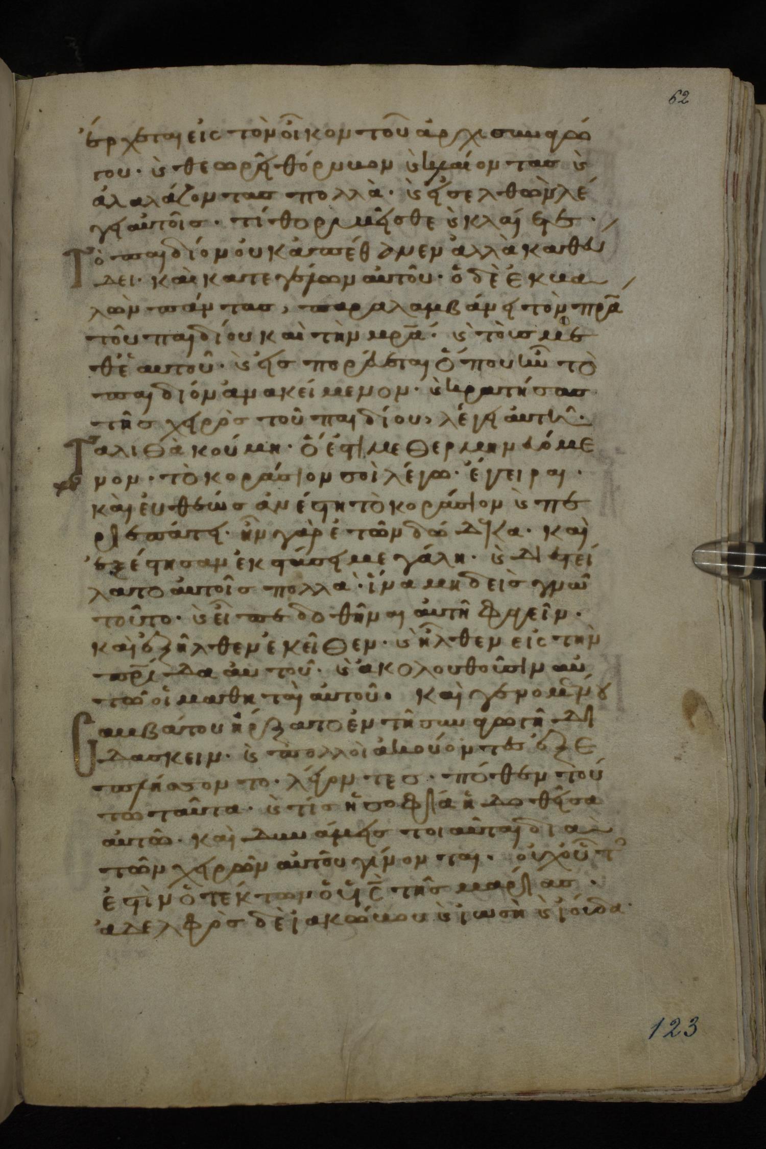 Twelfth century minuscule of the Gospels on parchment; 185 leaves, 1 column, 29 lines per column. Images were taken at the National Library of Greece in Athens.