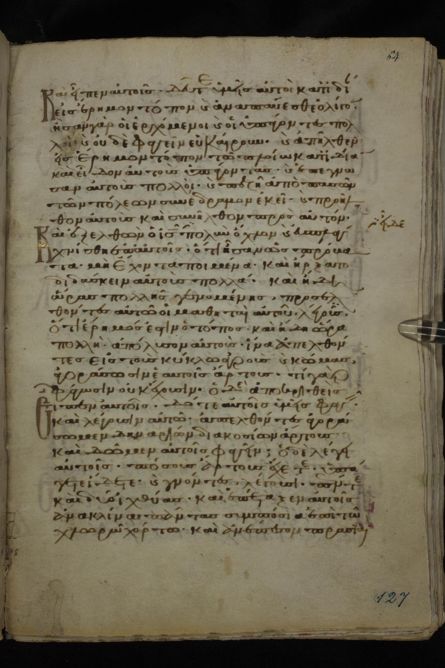Twelfth century minuscule of the Gospels on parchment; 185 leaves, 1 column, 29 lines per column. Images were taken at the National Library of Greece in Athens.