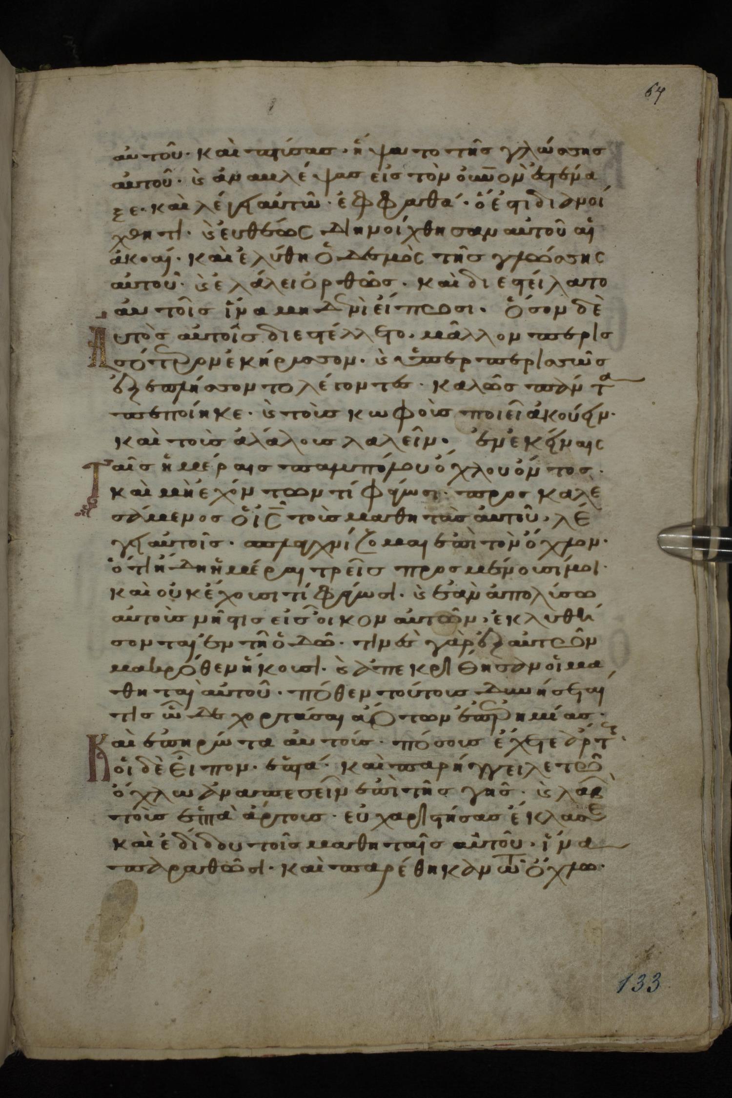 Twelfth century minuscule of the Gospels on parchment; 185 leaves, 1 column, 29 lines per column. Images were taken at the National Library of Greece in Athens.