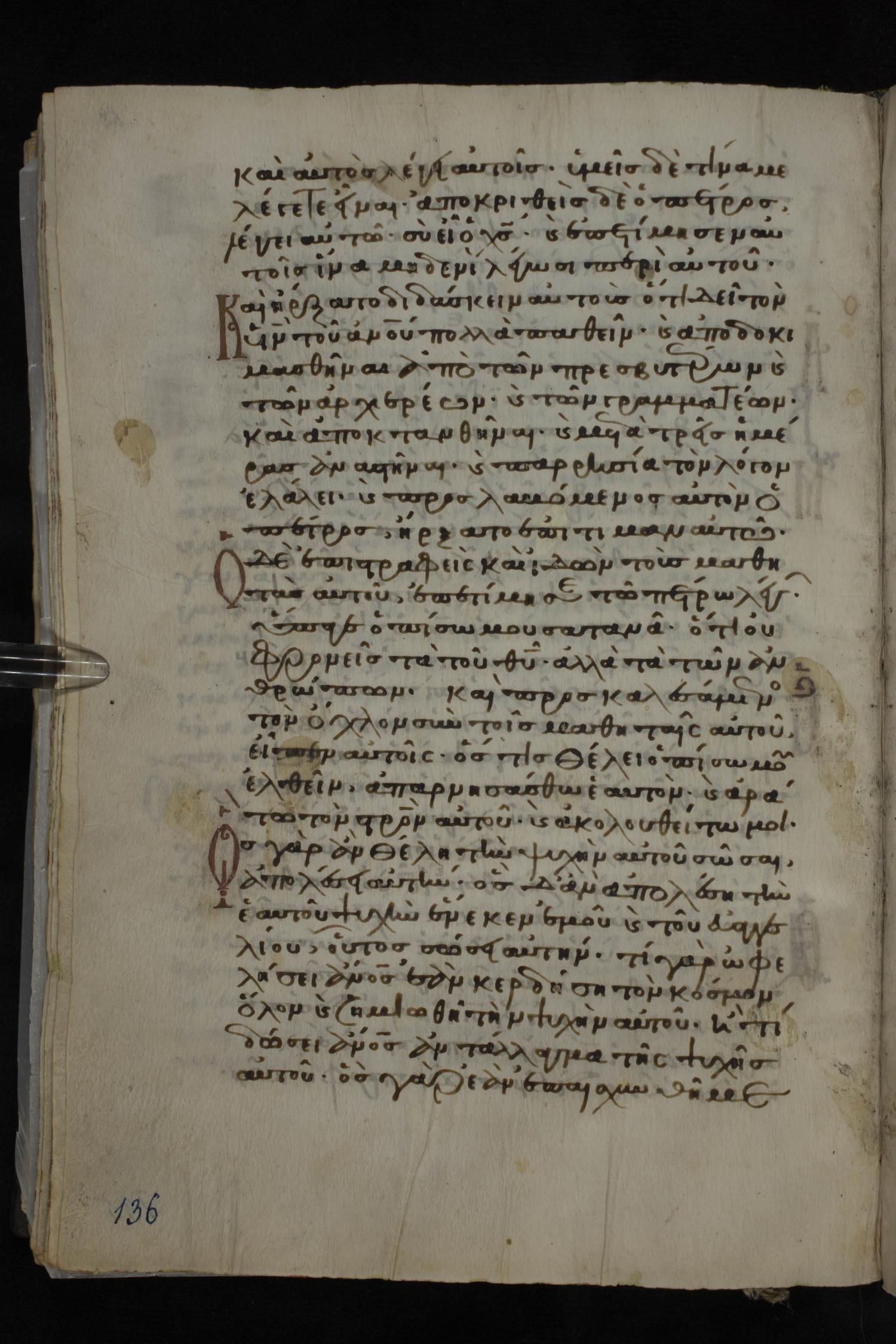 Twelfth century minuscule of the Gospels on parchment; 185 leaves, 1 column, 29 lines per column. Images were taken at the National Library of Greece in Athens.