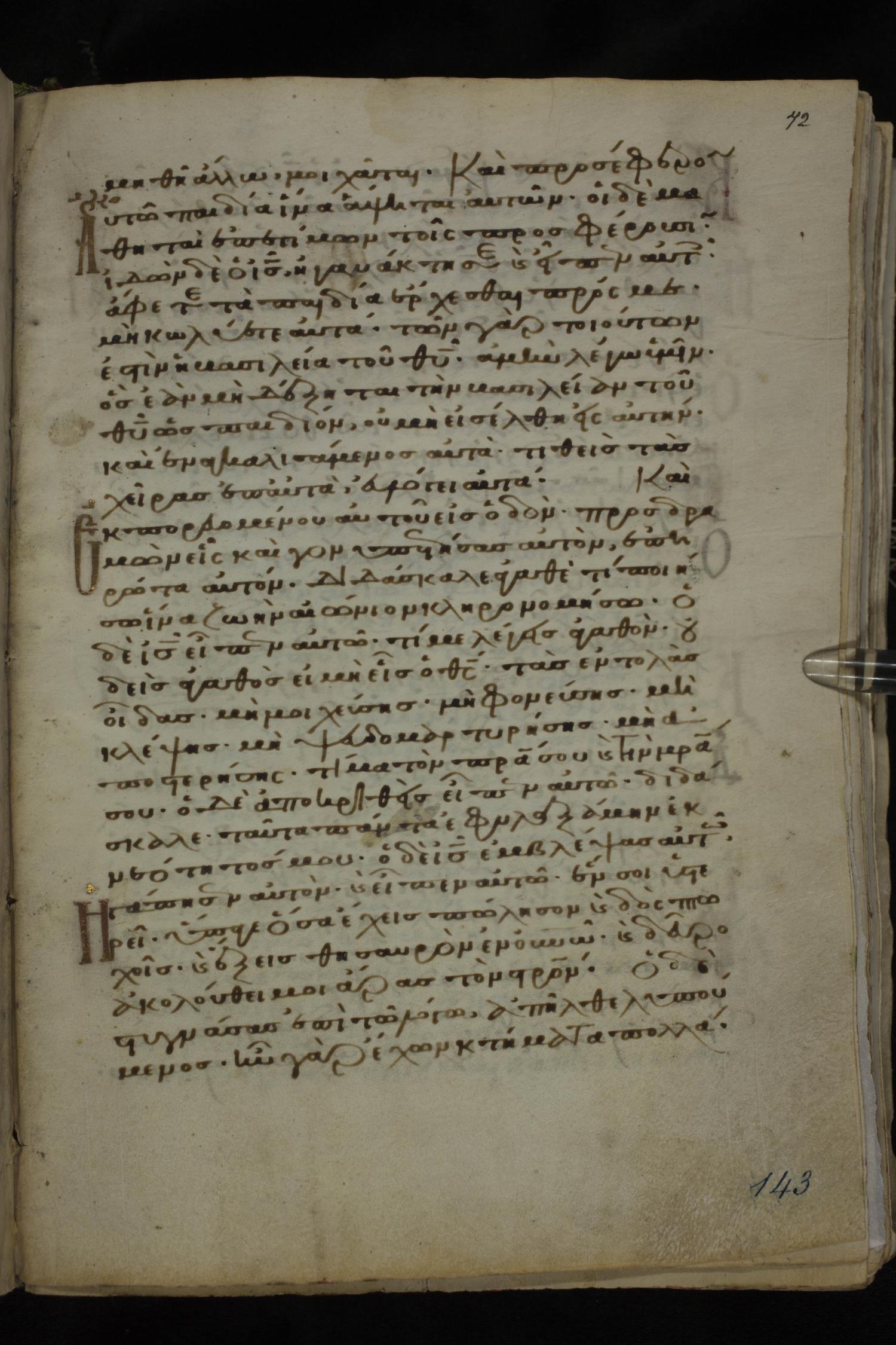 Twelfth century minuscule of the Gospels on parchment; 185 leaves, 1 column, 29 lines per column. Images were taken at the National Library of Greece in Athens.
